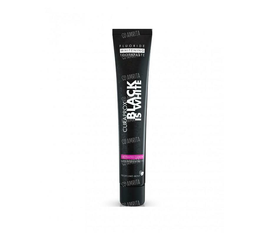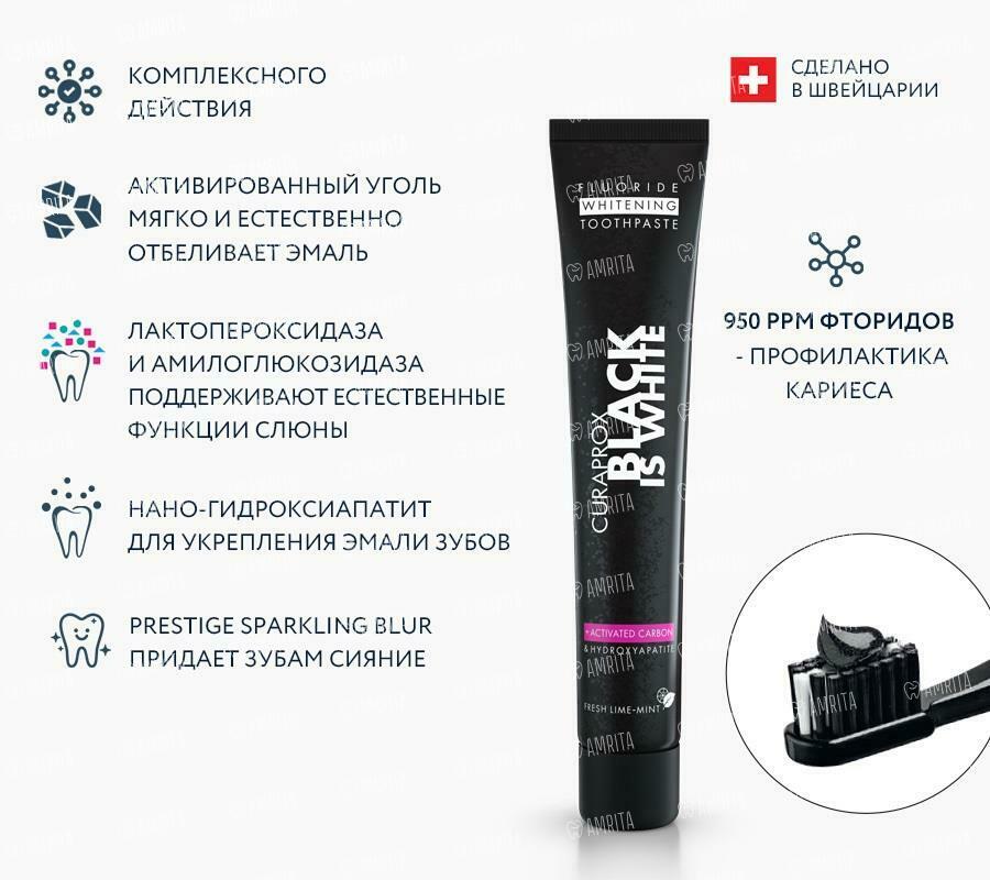 Чёрная зубная паста «Black is White» с активированным углём и мягким вкусом лайма. Паста комплексного действия с фторидами и нано-гидроксиапатитами.
