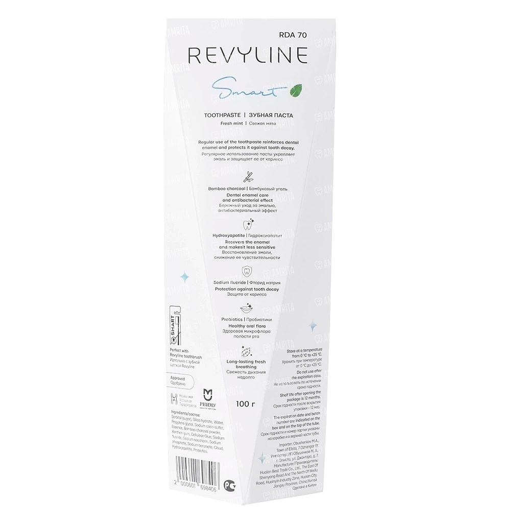 Зубная паста Revyline Smart Total Protection "Мята" разработана при участии стоматологов для комплексного ухода за полостью рта. Она рекомендована для ежедневного применения, в том числе при наличии виниров, имплантатов, брекетов и других ортодонтических конструкций. Благодаря содержанию гидроксиапатита (15%) паста эффективно реминерализует эмаль и снижает её гиперчувствительность, а фторид натрия (1450 ppm) обеспечивает надежную защиту от кариеса. Входящие в состав пробиотики поддерживают естественный баланс микрофлоры. Мятный вкус придает дыханию свежесть. Регулярное использование средства возвращает зубам природную белизну. Паста представлена в тубе весом 100 г.