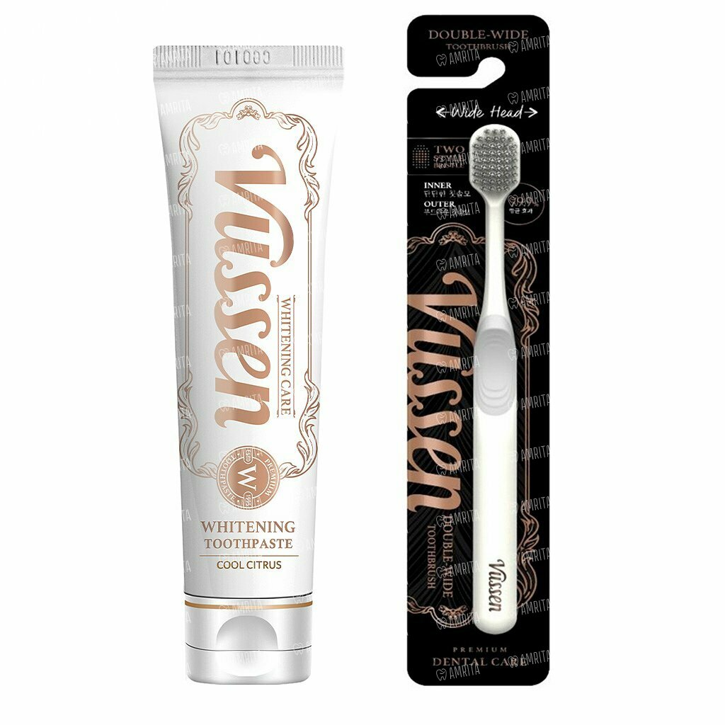Набор зубная паста Vussen W "Цитрусовая свежесть", отбеливающая + белая щётка Vussen "Double-Wide", 120 г
