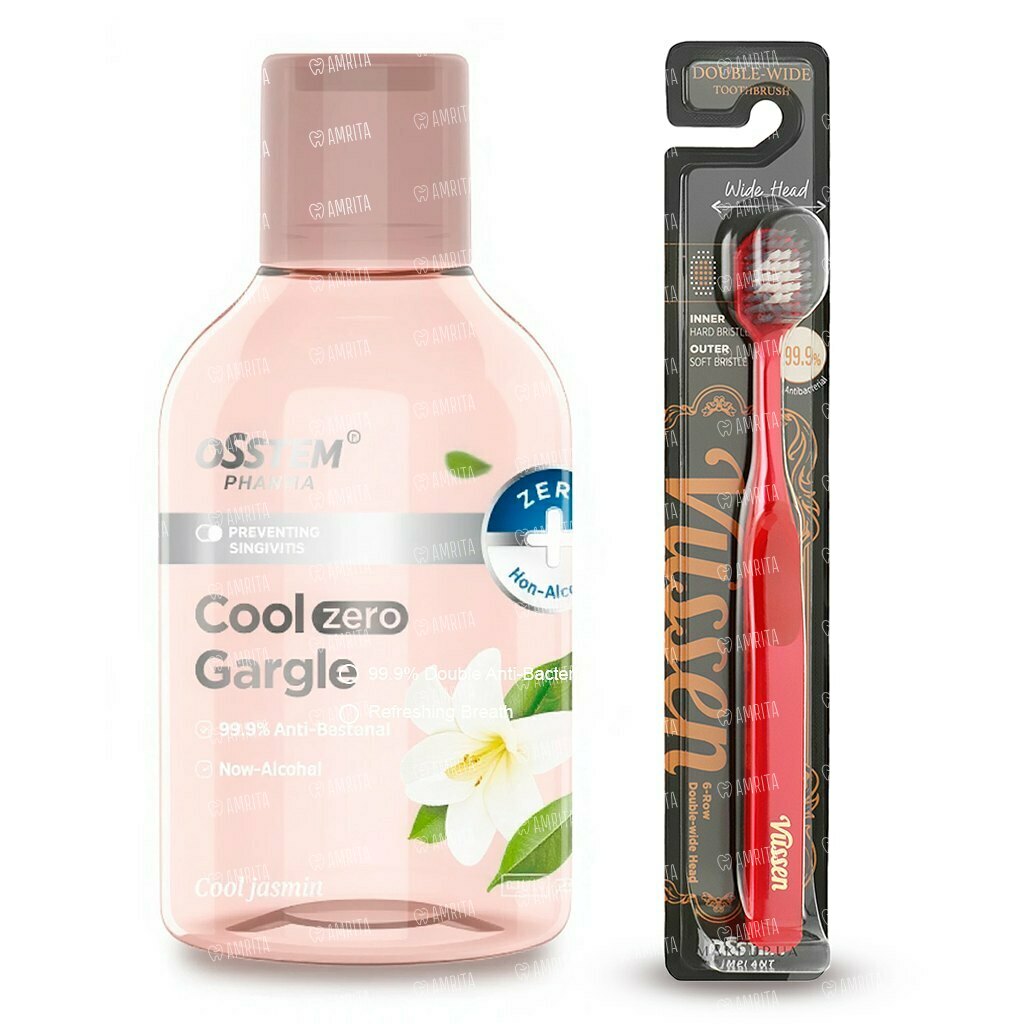 Набор для деликатного ухода Vussen Cool Gargle + Double-Wide включает в себя мягкий ополаскиватель с ароматом жасмина и зубную щетку с увеличенной очищающей поверхностью. Ополаскиватель Vussen Cool Gargle не содержит спирта и красителей, что делает его подходящим для пациентов с чувствительными зубами и деснами. Его щадящая формула помогает предотвращать кариес и аккуратно удаляет налет, не вызывая раздражения слизистой. Специальная зубная щетка Double-Wide с широкой головкой обеспечивает плотный контакт с поверхностью зубов, значительно повышая эффективность ежедневной гигиены.
