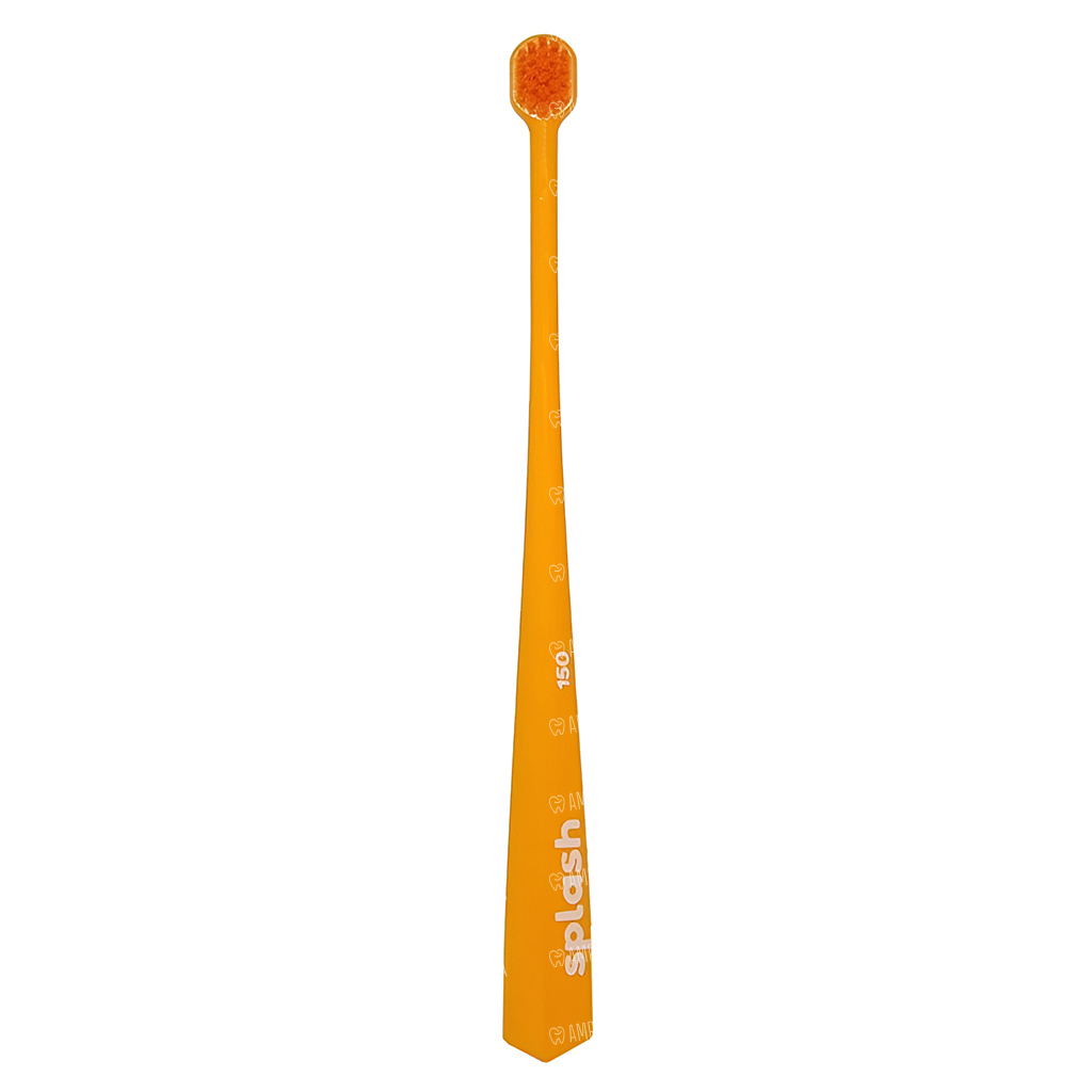 Зубная щетка Splash brush 150 оранжевого цвета с мягкой щетиной, диаметром щетинок 0,15 мм, предназначена для очистки зубов, брекетов и имплантатов. Щетка достает до всех участков зуба, включая заднюю стенку.