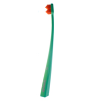 - Зубная щетка изогнута и дополнена пирамидальной головкой с треугольными прорезиненными щетинками, что позволяет эффективно очищать зубы даже в труднодоступных местах;