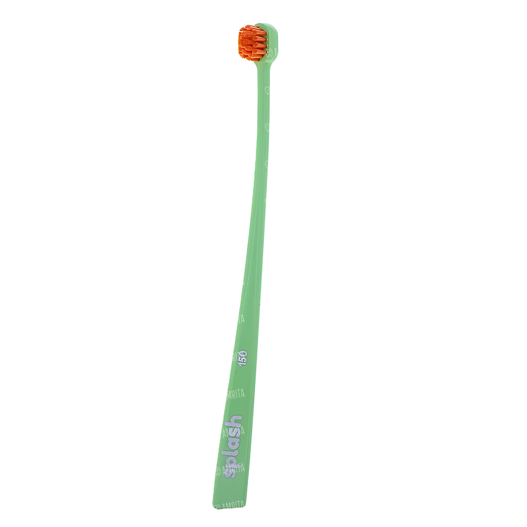 Зубная щетка Splash brush 150 салатового цвета с мягкой щетиной, диаметром щетинок 0,15 мм, предназначена для очистки зубов, брекетов и имплантатов. Щетка достает до всех участков зуба, включая заднюю стенку.