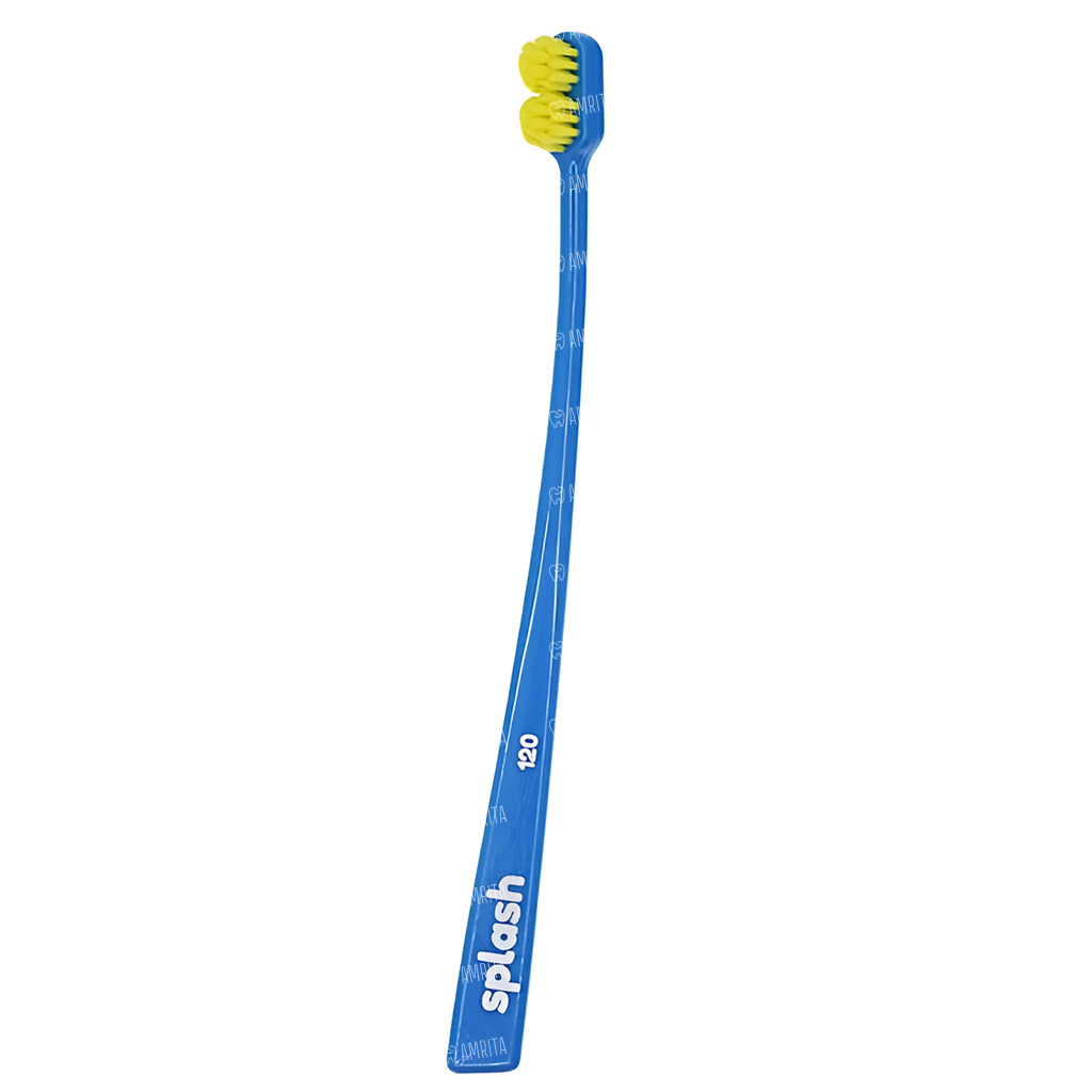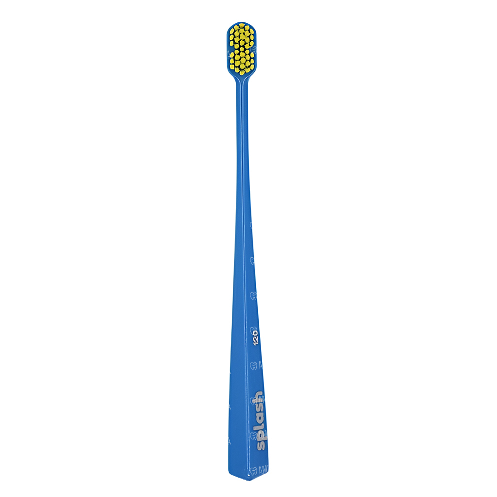 Зубная щетка Splash brush 120 синего цвета с очень мягкой щетиной, диаметром щетинок 0,12 мм, предназначена для очистки зубов, брекетов и имплантатов. Щетка достает до всех участков зуба, включая заднюю стенку.