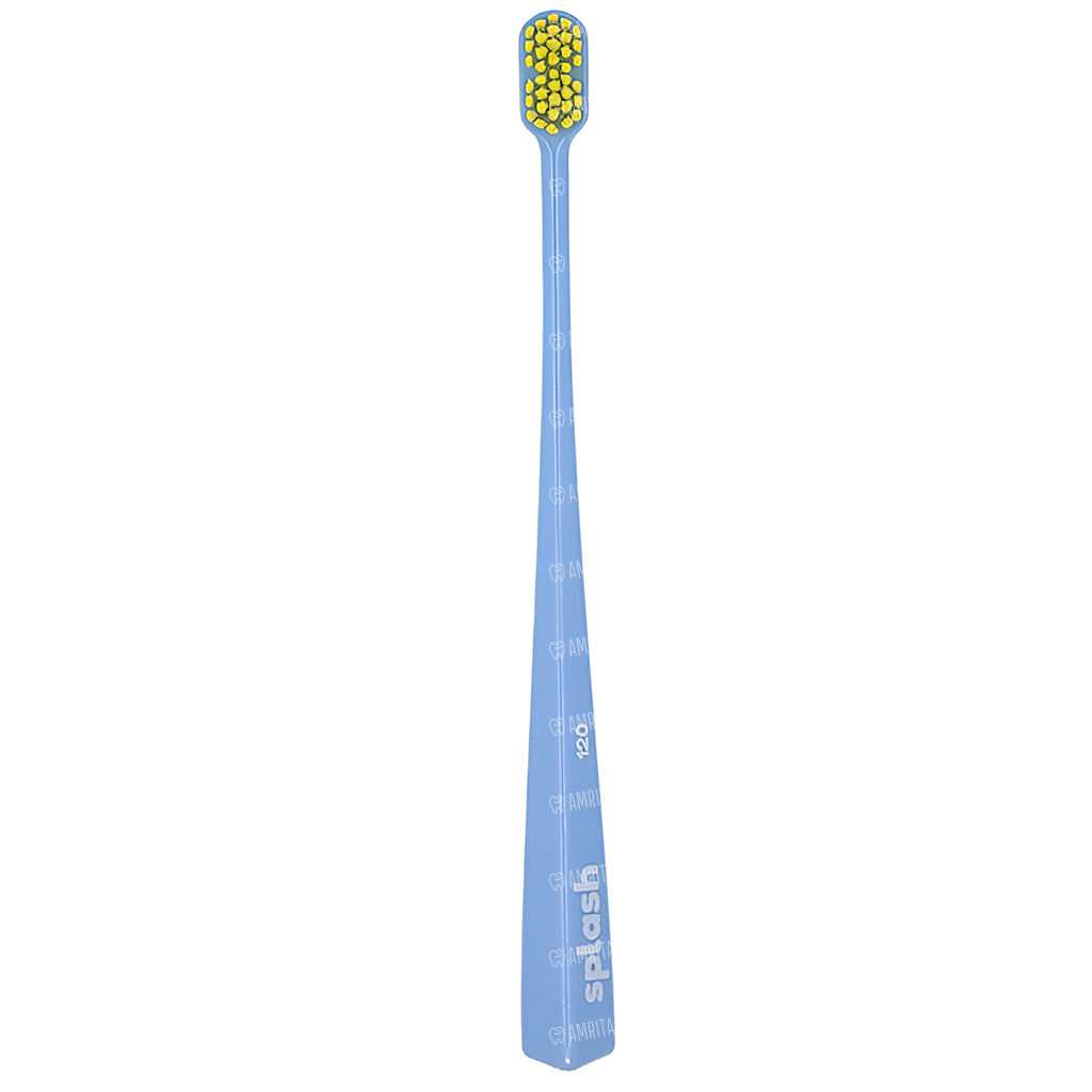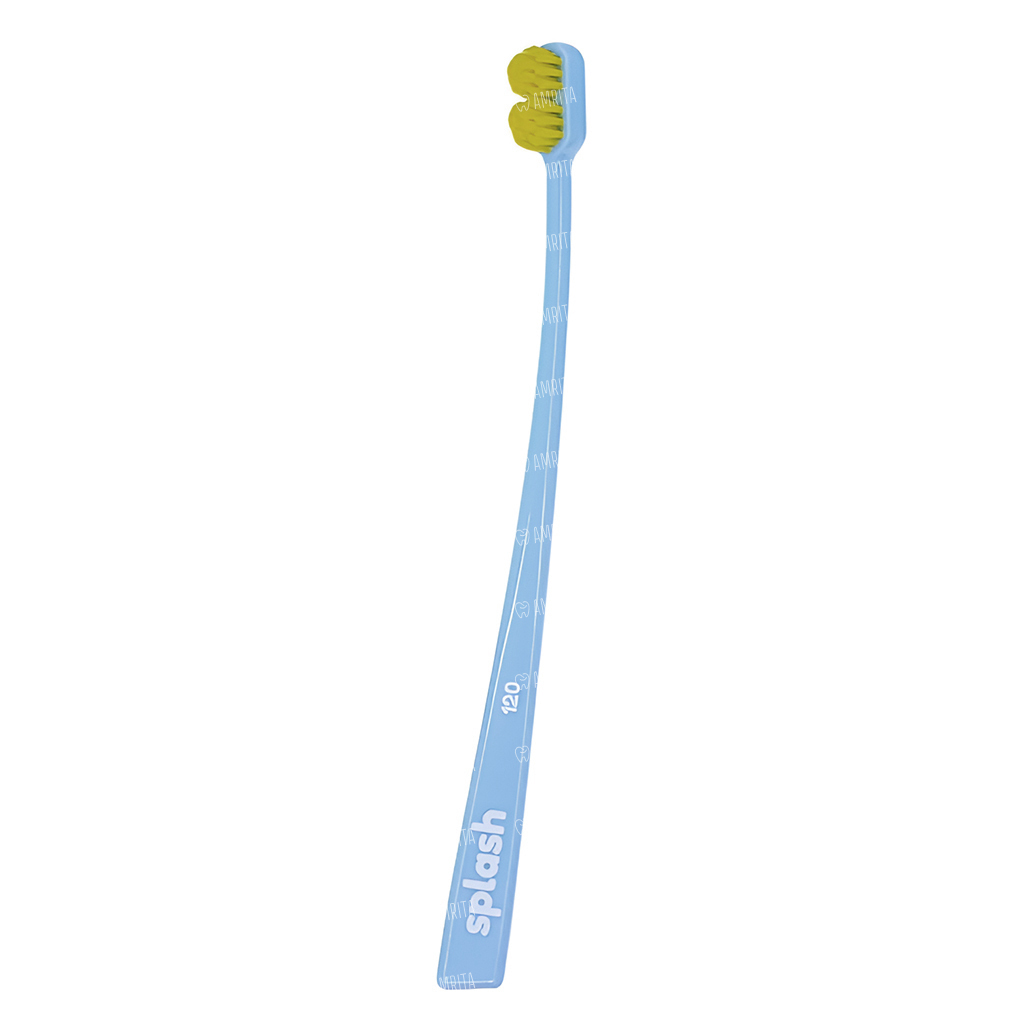 Зубная щетка Splash brush 120 голубого цвета с очень мягкой щетиной, диаметром щетинок 0,12 мм, предназначена для очистки зубов, брекетов и имплантатов. Щетка достает до всех участков зуба, включая заднюю стенку.