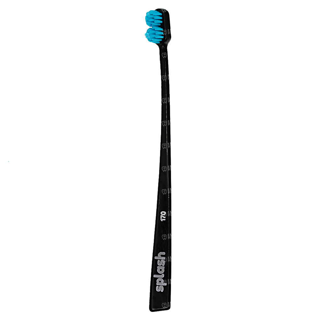 Зубная щетка Splash brush 170 черного цвета с щетиной средней жесткости, диаметром щетинок 0,17 мм, предназначена для очистки зубов, брекетов и имплантатов. Щетка достает до всех участков зуба, включая заднюю стенку.