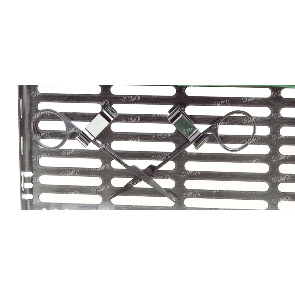 Форма, размер и конструкция петли позволяет надежно закрепить ножницы, пинцеты, кровоостанавливающие зажимы в раскрытом виде, наконечники для шприцев с воздухом/водой в крышке кассеты.
