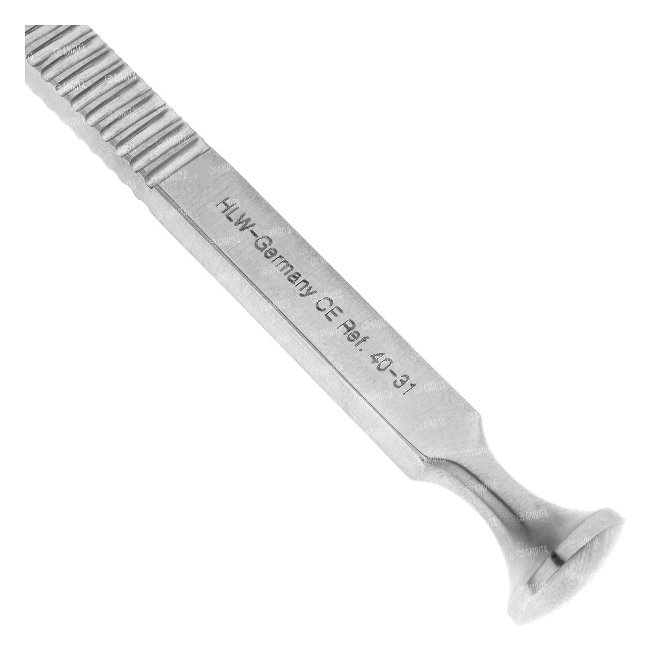 Инструмент имеет уплощенную форму с плавным изгибом рабочей части на угол не менее 45 градусов. Применяется вместе с медицинским молотком, снабжен широкой ударной поверхностью, защищающей руку врача. Поперечные ретенционные полосы на обоих сторонах инструмента позволяют достичь хорошей фиксации инструмента в руке. На рабочей части шириной не более 4 мм имеется градуировка глубин 6, 9, 12, 14 и 17мм.