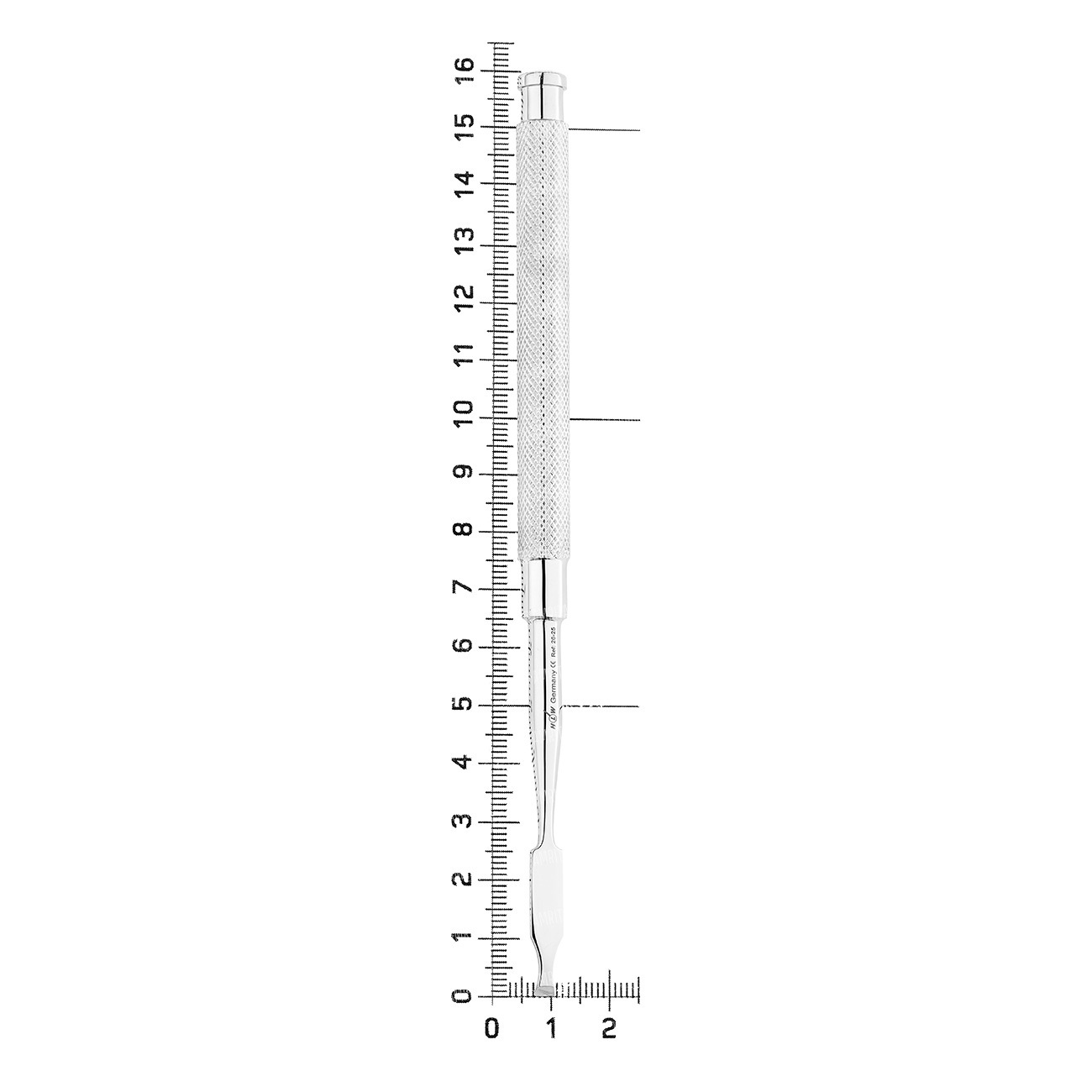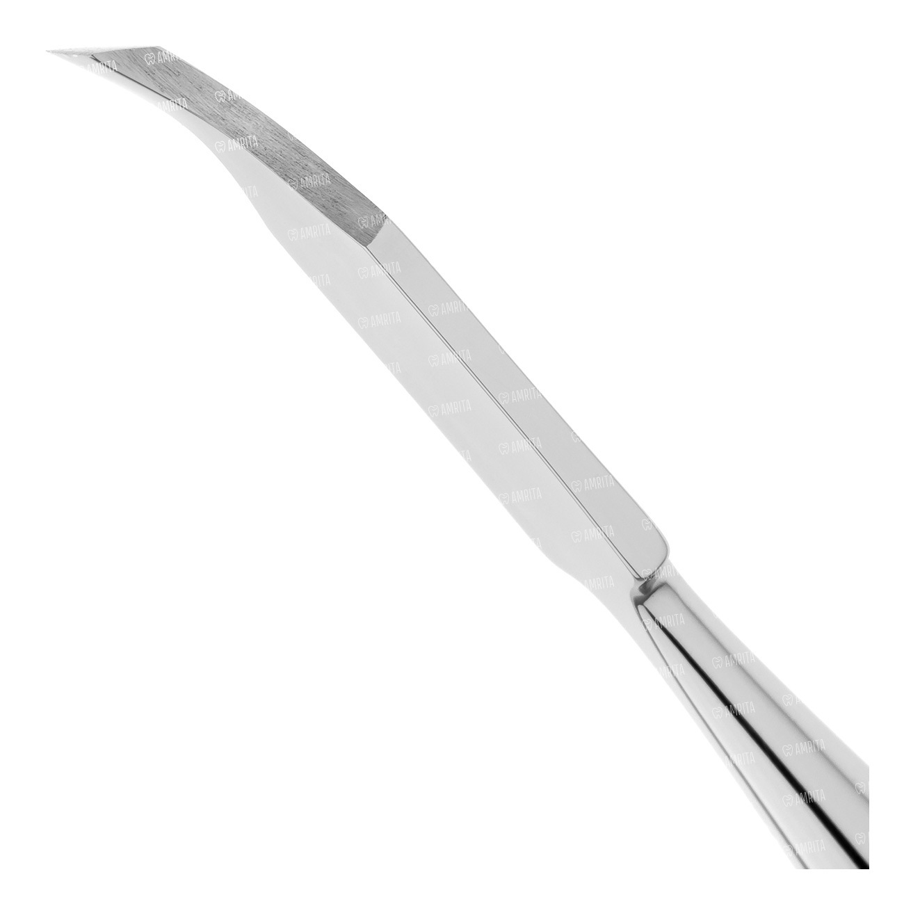 Инструмент представляет из себя вытянутую цилиндрическую рукоятку с ретенционным узором, оканчивающуюся изогнутой рабочей частью с режущей кромкой.