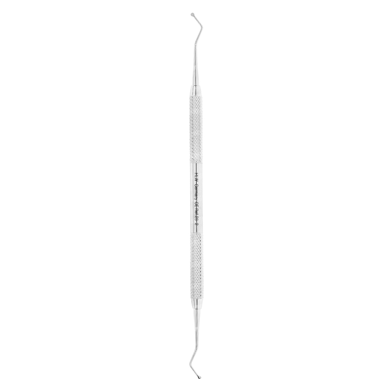 Экскаватор стоматологический круглый двухсторонний. Рабочие части инструмента выполнены в виде круглого блюдца диаметром не более 1,5 мм и имееют острую режущую грань по периметру. Рабочие части имеют двойной изгиб с обеих сторон.