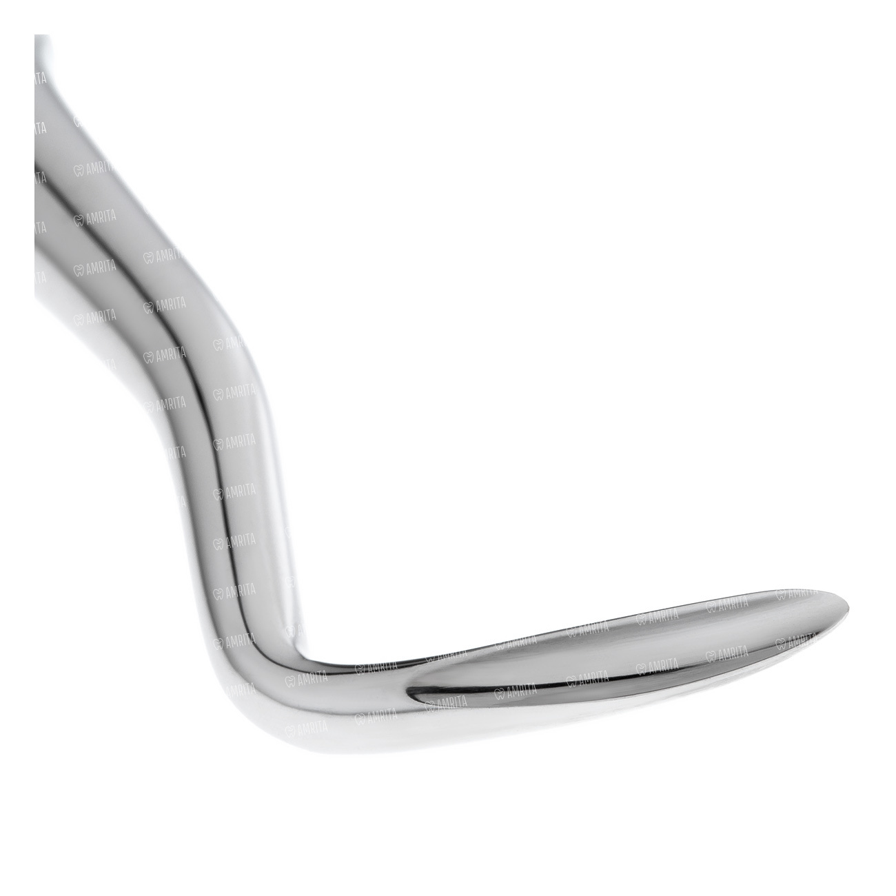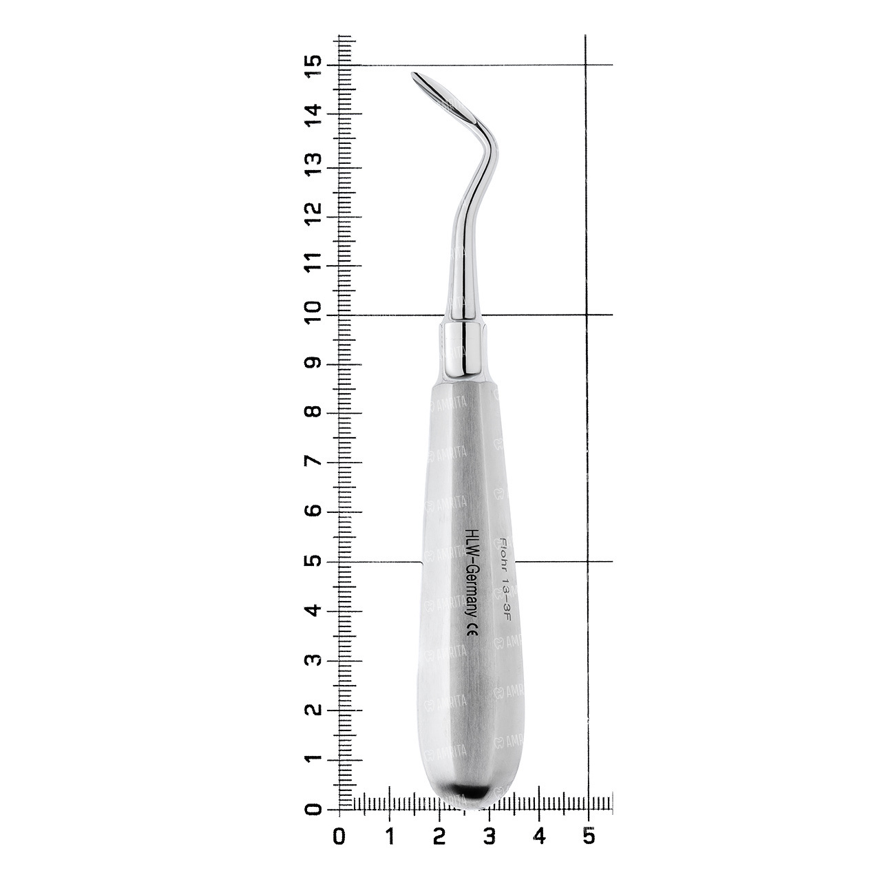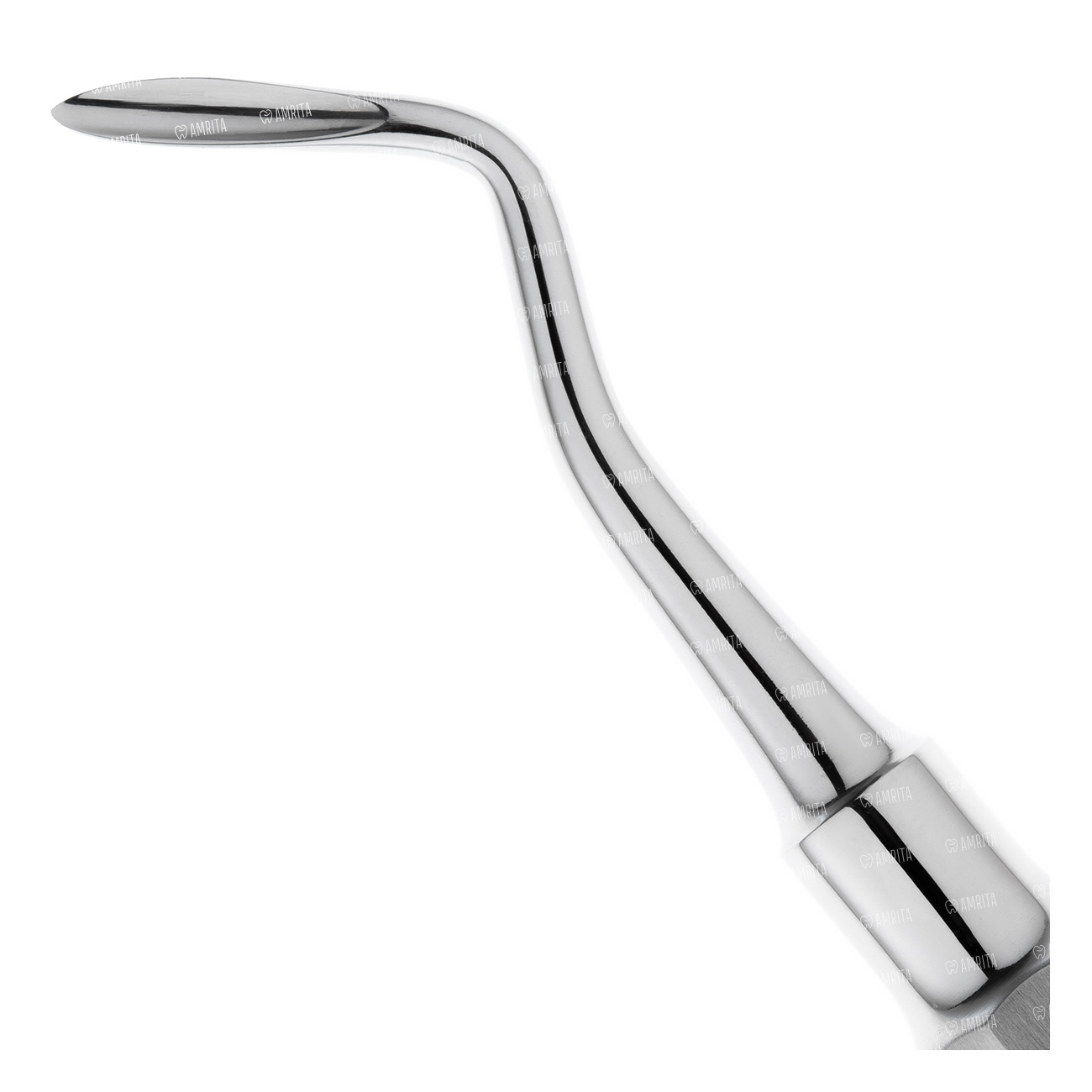 Элеватор изогнутый конструкции ФЛОХА на себя. Рабочая часть имеет двойной разнонаправленный изгиб по ребру, заостренный край и выемку в форме жёлоба. Ширина рабочей части не более 4 мм. Полая восьмигранная ручка плавно переходит в функциональный стержень инструмента.
