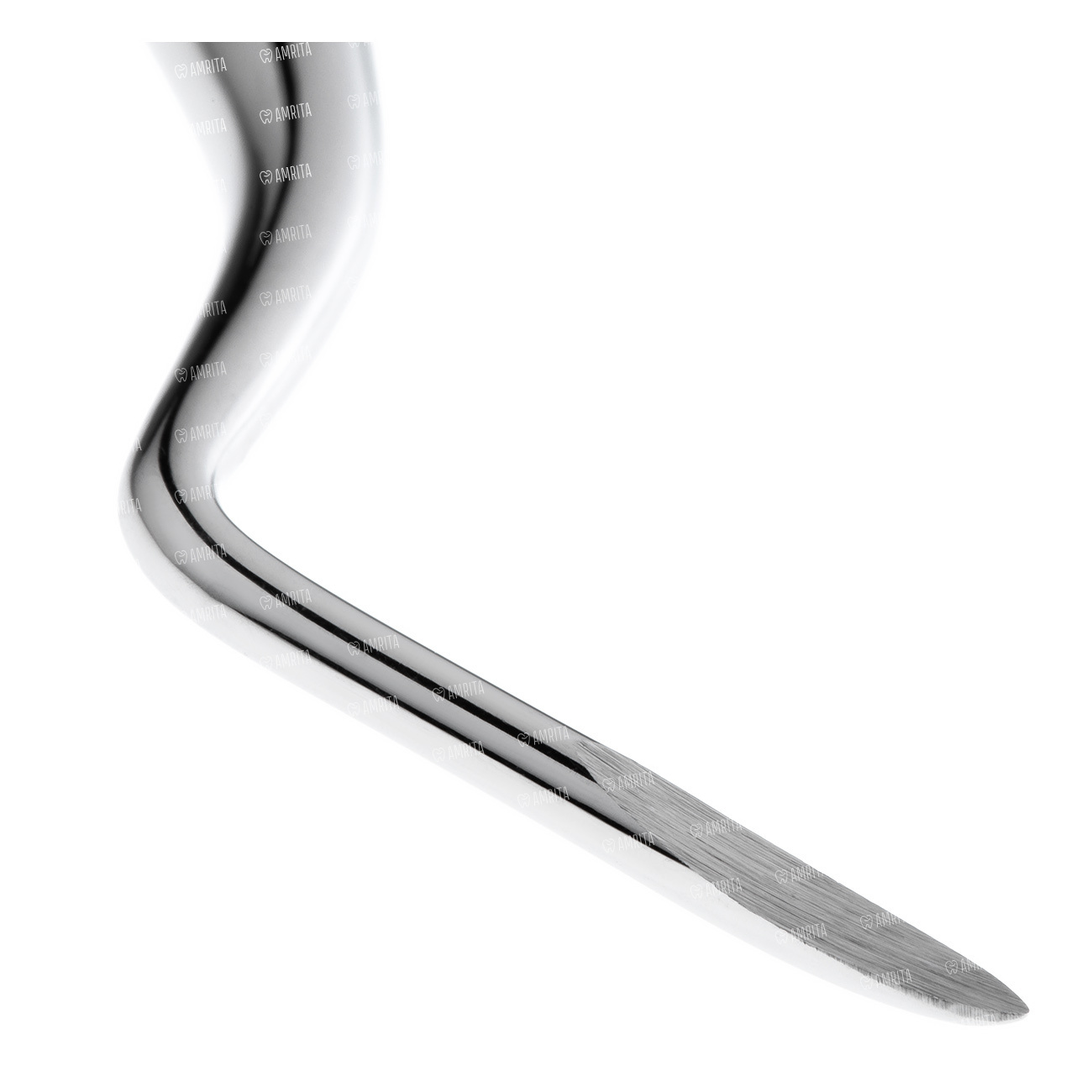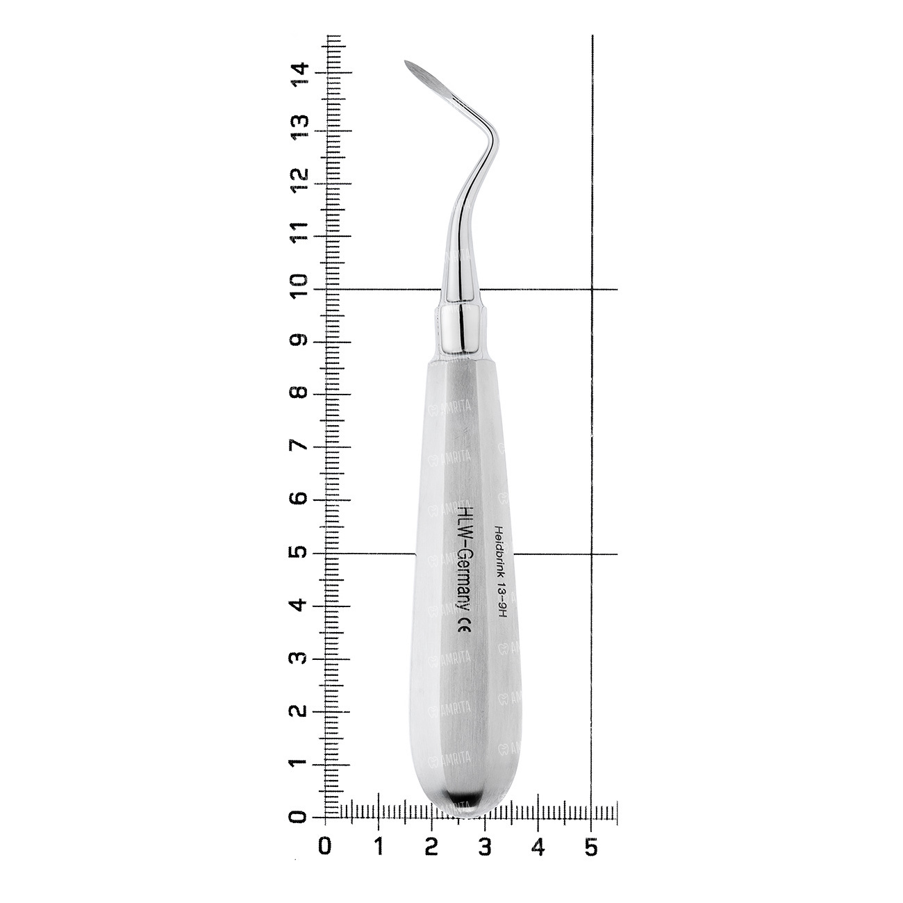 Элеватор изогнутый конструкции ХЕЙДБРИНКА на себя. Рабочая часть имеет двойной разнонаправленный изгиб по ребру, заостренный край в виде когтя. Ширина рабочей части не более 2,5 мм. Полая восьмигранная ручка плавно переходит в функциональный стержень инструмента.