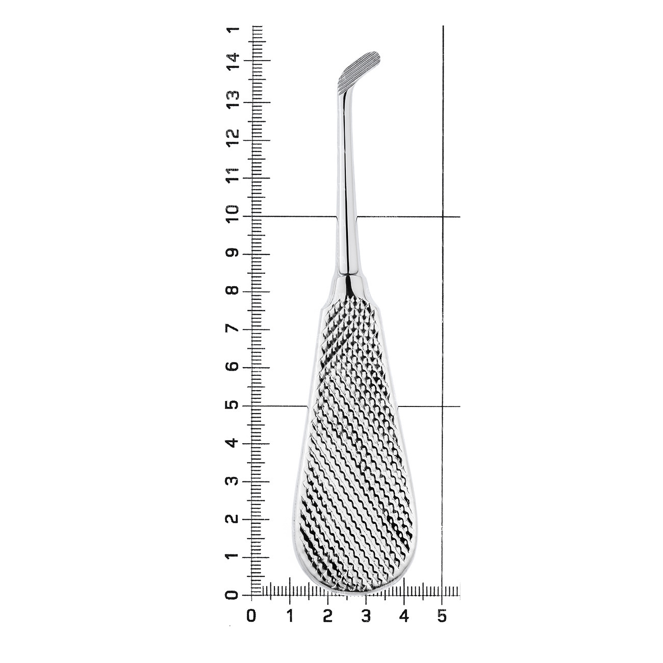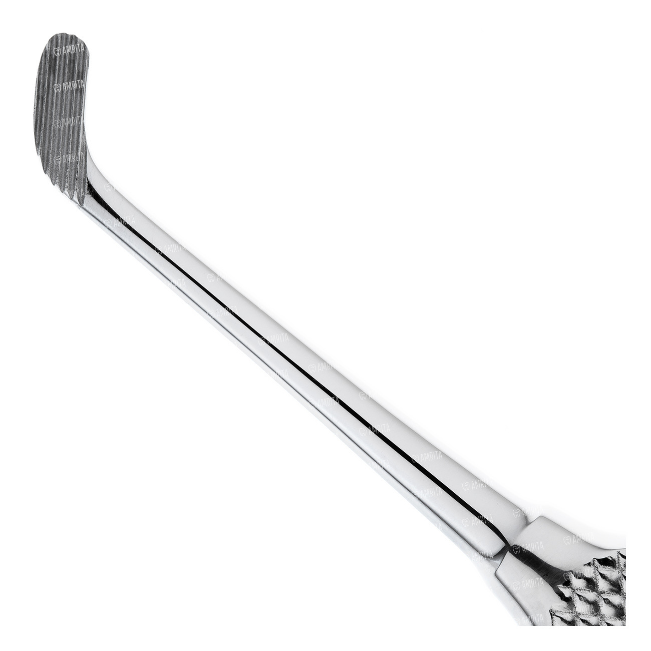 На рабочей поверхности имеется микроретенционные насечки, для лучшей фиксации на поверхности корня. Ручка уплощена, по плоскостям большей площади нанесены ретенционные пункты, предотвращающие скольжение инструмента в кисти.