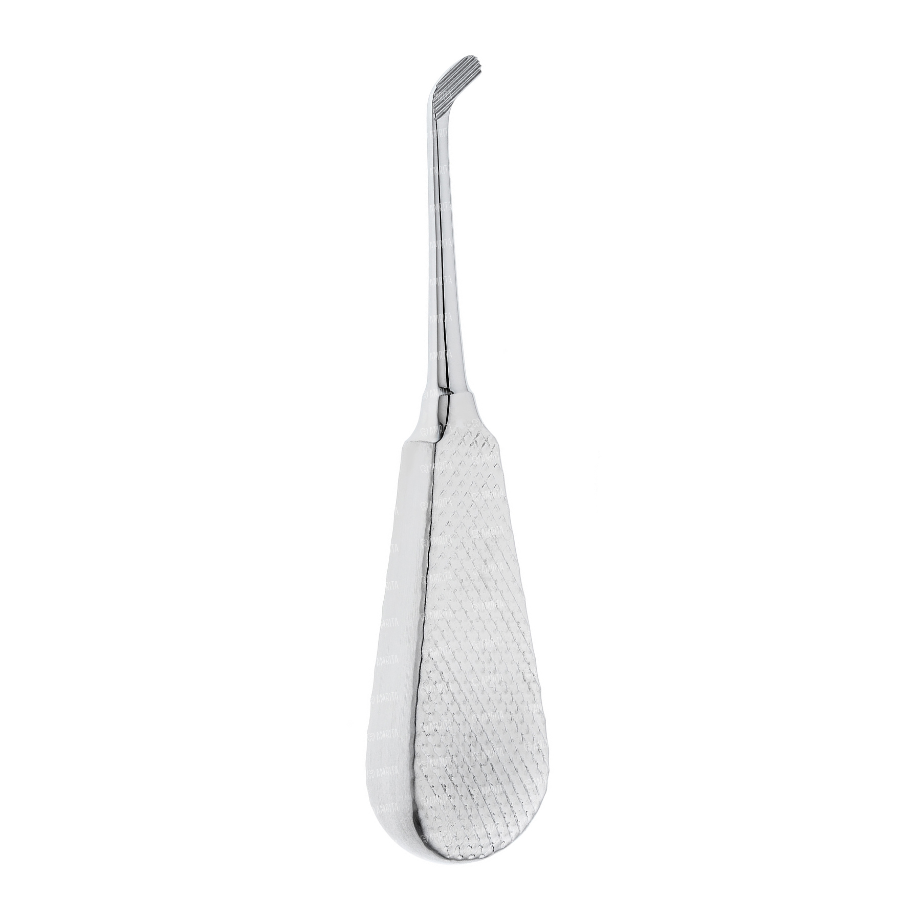 Элеватор угловой левый, предназначенный для удаления корней зубов на нижней челюсти. Имеет рабочую часть функционального стержня обращённую "отсебя" удобную для работы с зубами левой стороны нижней челюсти (приложения усилия от мезиальной поверхности в дистальном направлении).