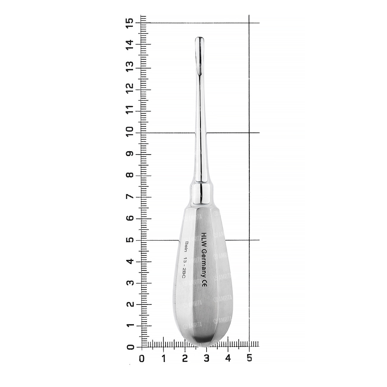 Элеватор конструкции БЕЙНА изогнутый по плоскости. Рабочая часть с одиночным изгибом по плоскости имеет закруглённый край и выемку в форме жёлоба. Ширина рабочей части не более 4 мм. Полая восьмигранная укороченная ручка конструкции БЕЙНА плавно переходит в функциональный стержень инструмента.