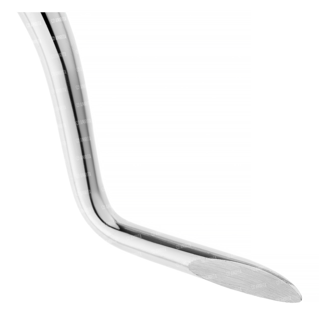 Элеватор изогнутый конструкции ФРИДМАННА на себя. Рабочая часть имеет двойной разнонаправленный изгиб по ребру, заостренный край в виде когтя. Ширина рабочей части не более 3 мм. Полая восьмигранная ручка плавно переходит в функциональный стержень инструмента.