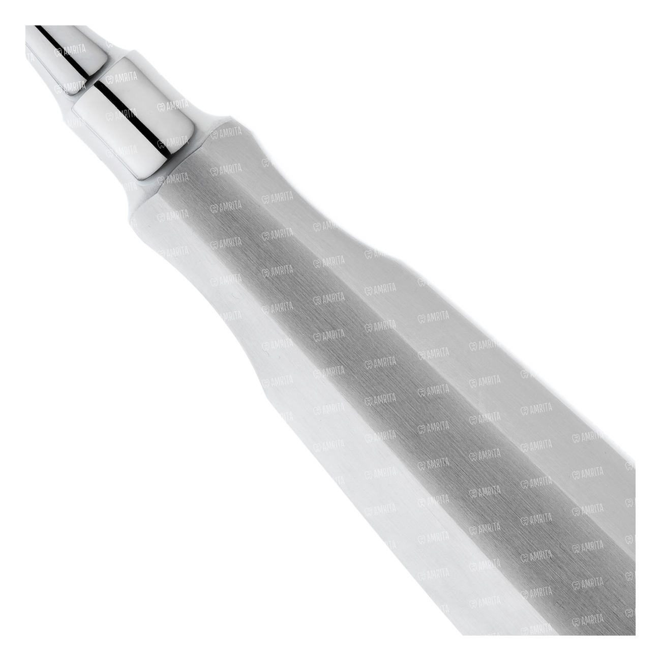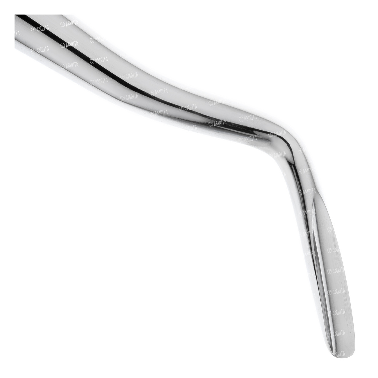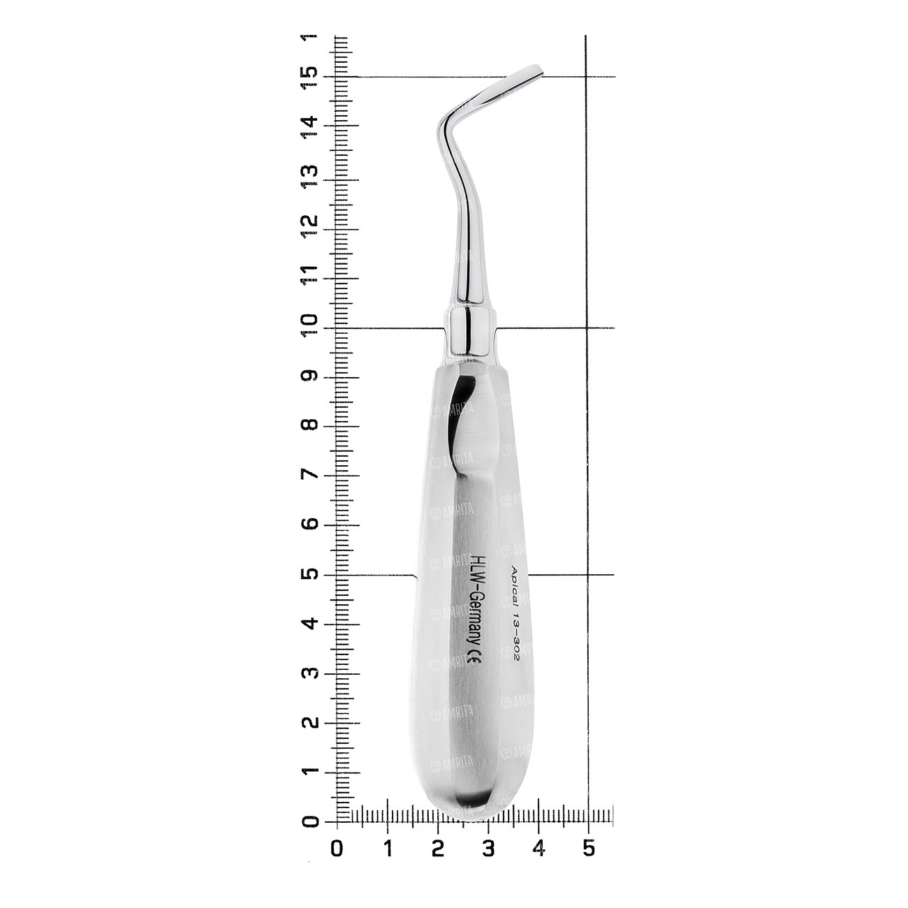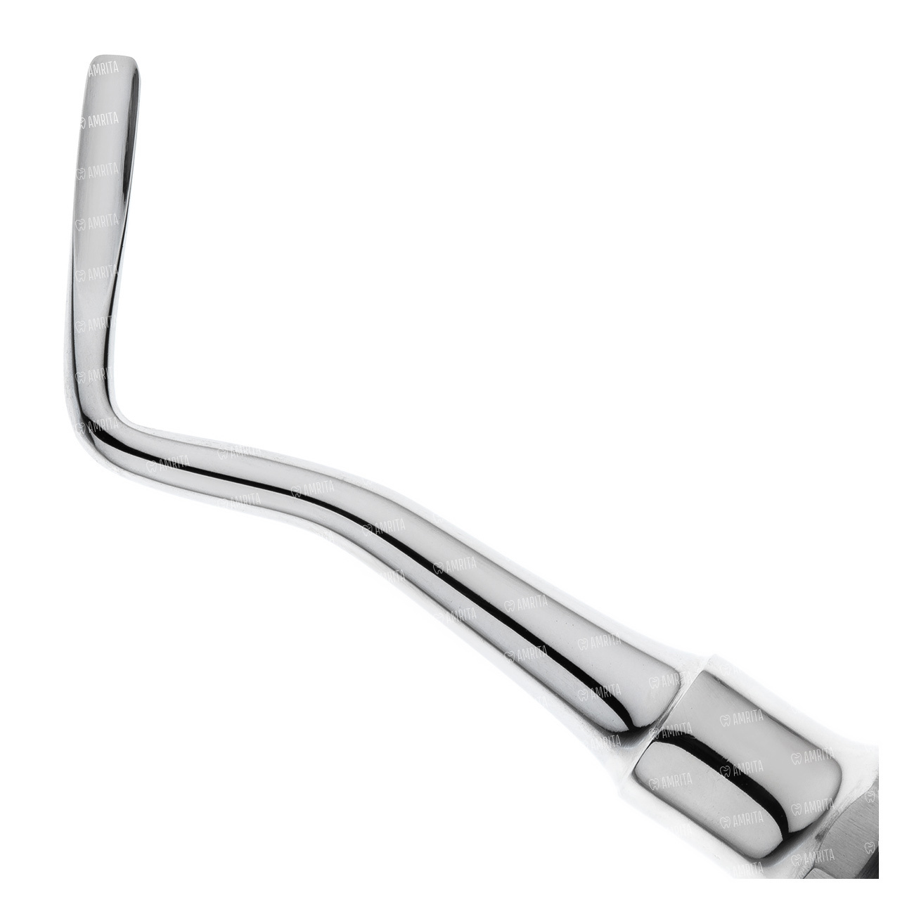 Элеватор апикальный изогнутый на себя. Рабочая часть изогнутая с байонетным изгибом, имеет закруглённый край и выемку в форме жёлоба. Ширина рабочей части не более 3 мм. Полая восьмигранная ручка с упорами под пальцы плавно переходит в прямой функциональный стержень инструмента.