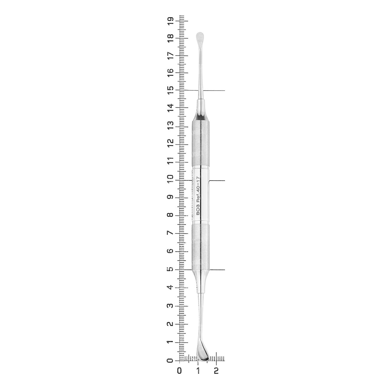 Рабочая часть выполнена в форме капли, что помогает избежать разрывов слизистой оболочки при отслаивании лоскута вблизи межзубных сосочков и десневого края. Ручка в виде полой трубки диаметром не менее 10 мм, зоны захвата имеют шероховатый микрорельеф, что позволяет осуществлять эргономичный захват и легко дозировать передаваемые усилия.