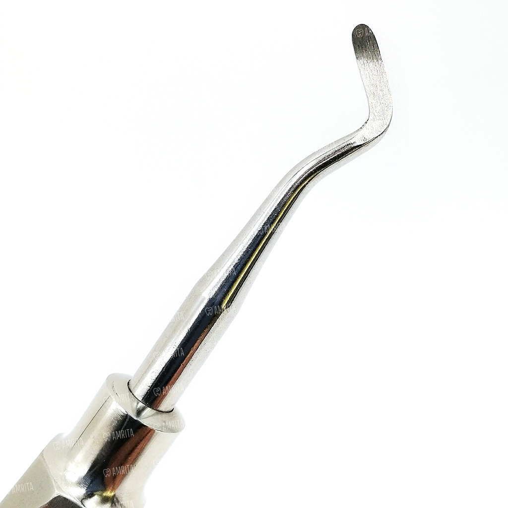 На ручке есть анатомическая выемка для комфорта врача. Инструмент сделан из нержавеющей стали, что позволяет дезинфицировать элеватор разными способами, в автоклаве в том числе.