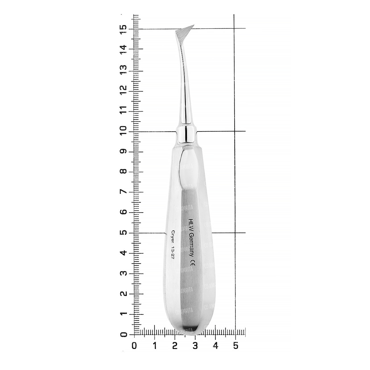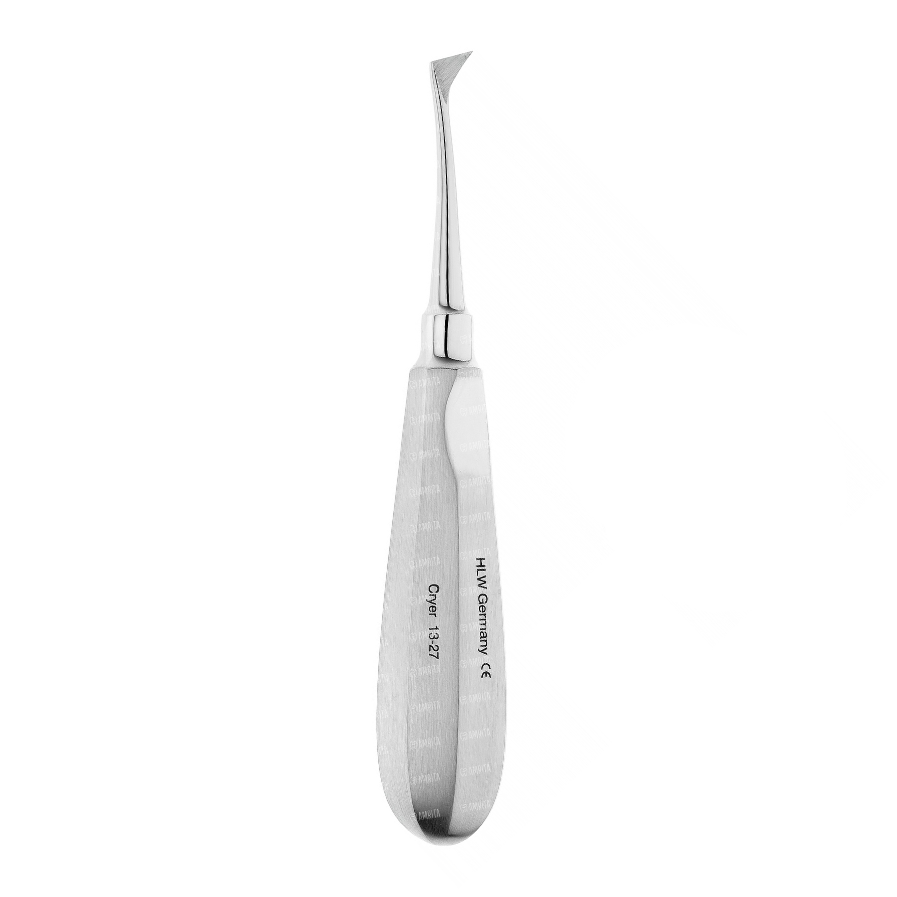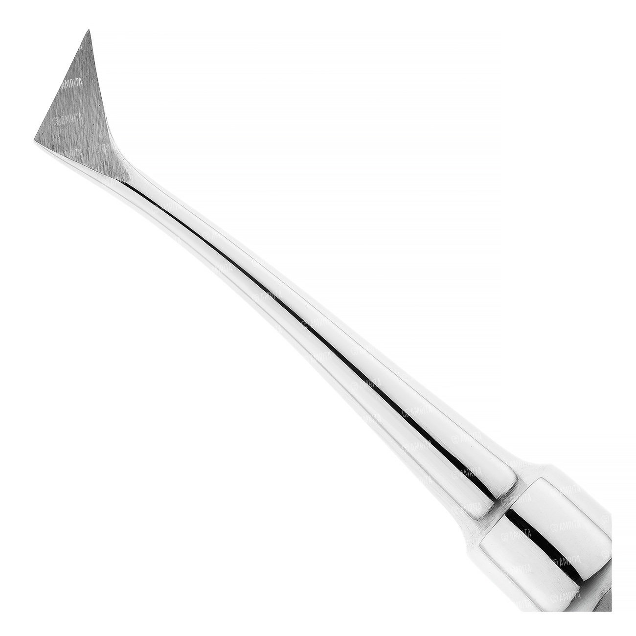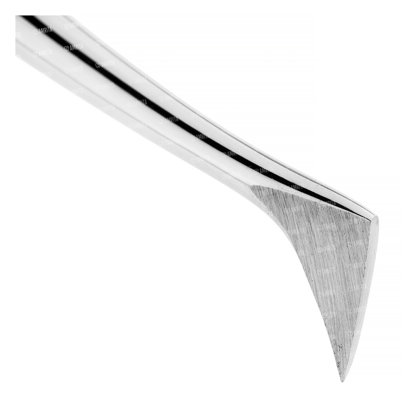 Элеватор изогнутый конструкции КРАЕРА от себя. Рабочая часть имеет одиночный изгиб по ребру и одиночный изгиб по плоскости. Рабочая часть острая в виде вытянутого треугольника. Полая восьмигранная ручка с упорами под пальцы с обеих сторон плавно переходит в функциональный стержень инструмента.