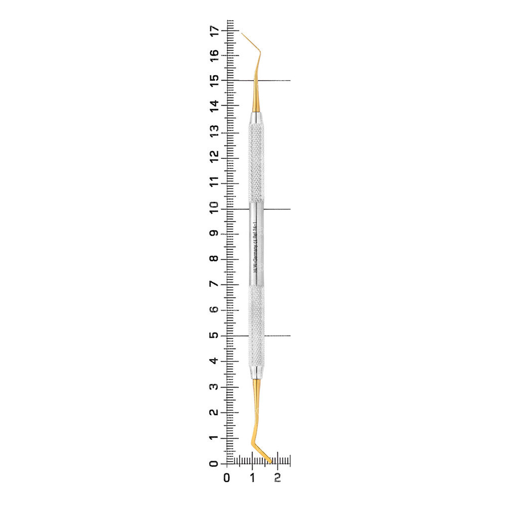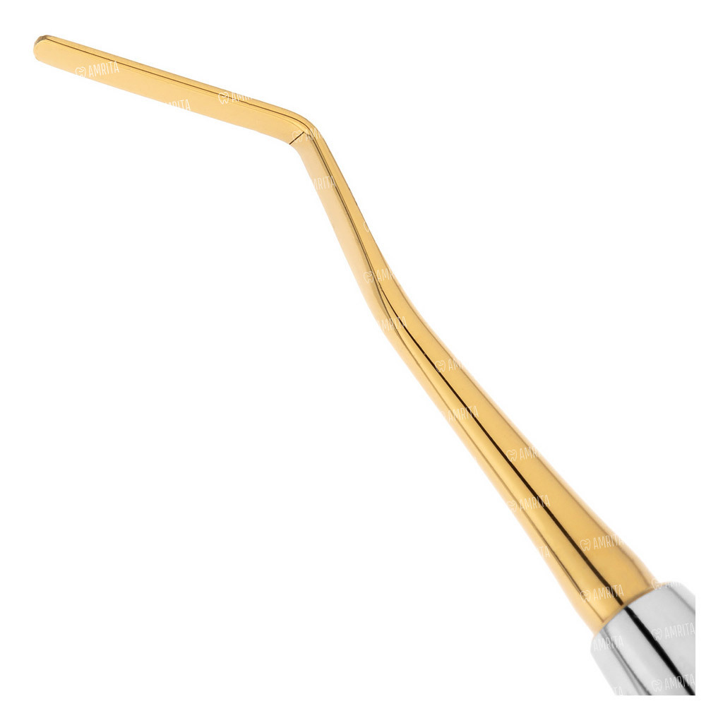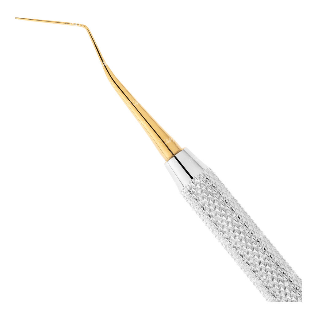 - Покрытие из нитрида титана с низкой адгезией. Золотистое покрытие рабочих частей придает инструменту исключительную твердость и, благодаря низкому коэффициенту адгезии, полностью предотвращает прилипание даже самых текучих композитов. Это обеспечивает чистоту работы, создает цветовой контраст для лучшей визуализации и исключает риск окрашивания реставрации частицами металла.