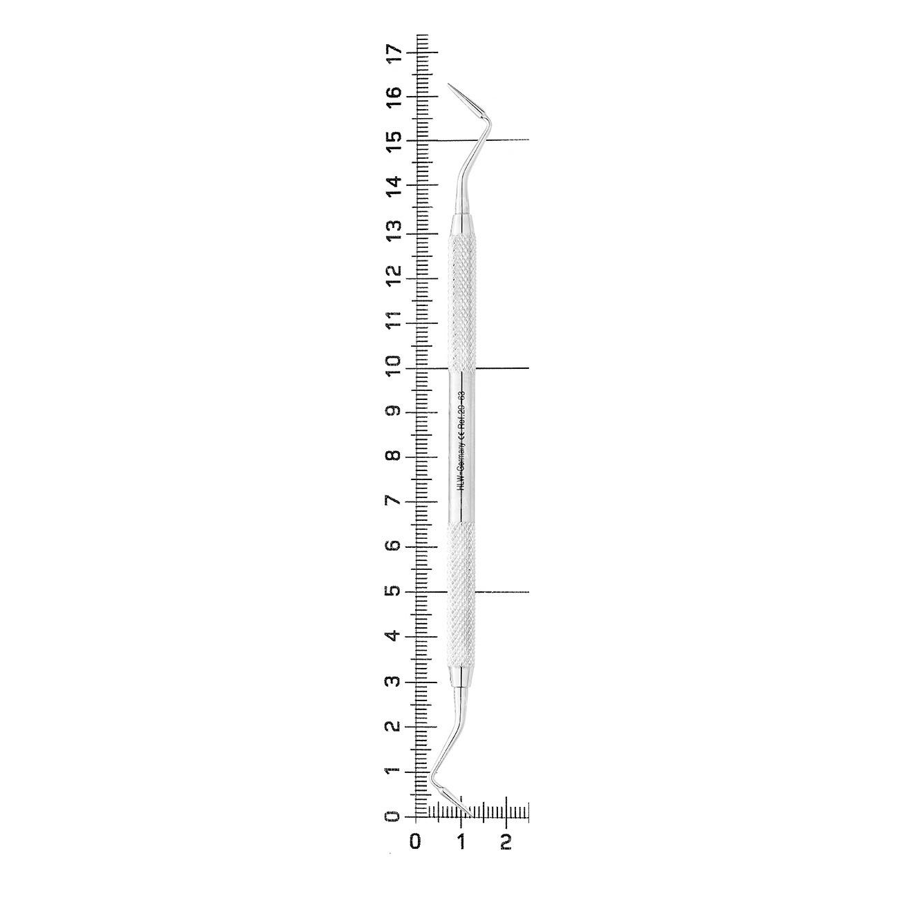 Гладилка двухстронняя моделировочная для придания формы фиссурам. Обе рабочие части имеют двойные байонетные изгибы по ребру, оканчиваются пиковидными штопферами удлиненной формы. Диаметр штопферов не более 3 мм, диаметр на конце рабочей части не более 1 мм.