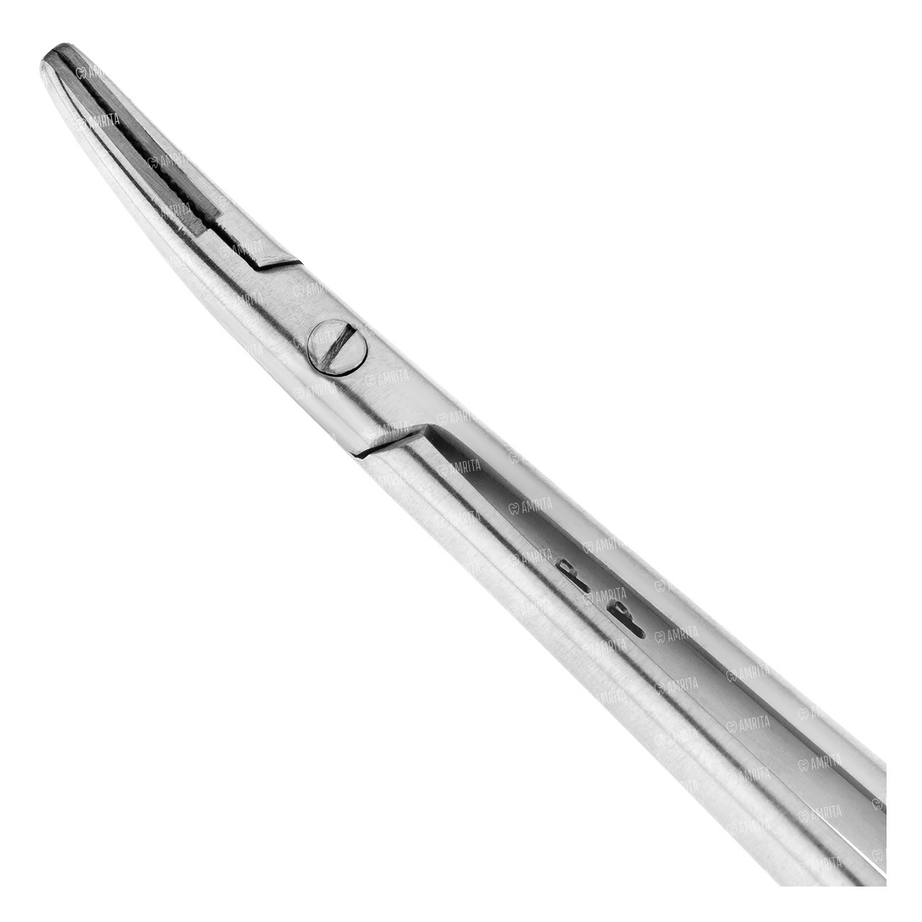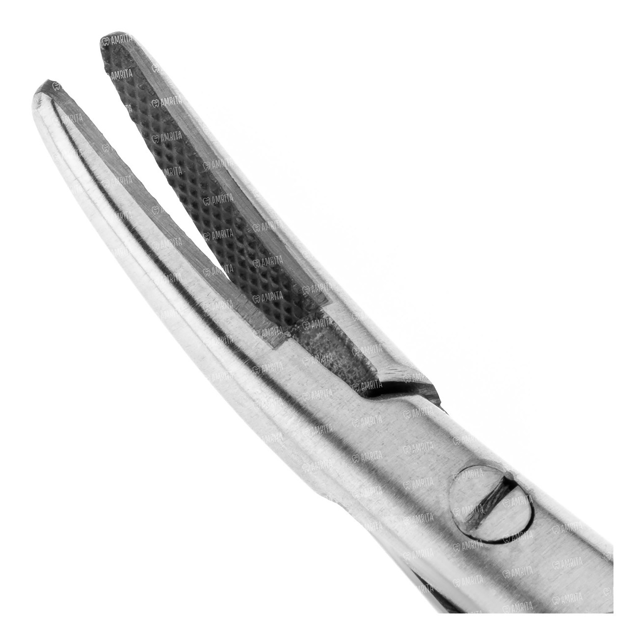 Иглодержатель безкольцевой хирургический КАСТРОВЬЕДЖО. Предполагает использование захвата по типу писчего пера. Наружная поверхность полукруглой формы покрыта продольно-поперечными насечками для надежного удержания инструмента в руке. С внутренней стороны рукояток установлен нажимной одноступенчатый фиксатор.
