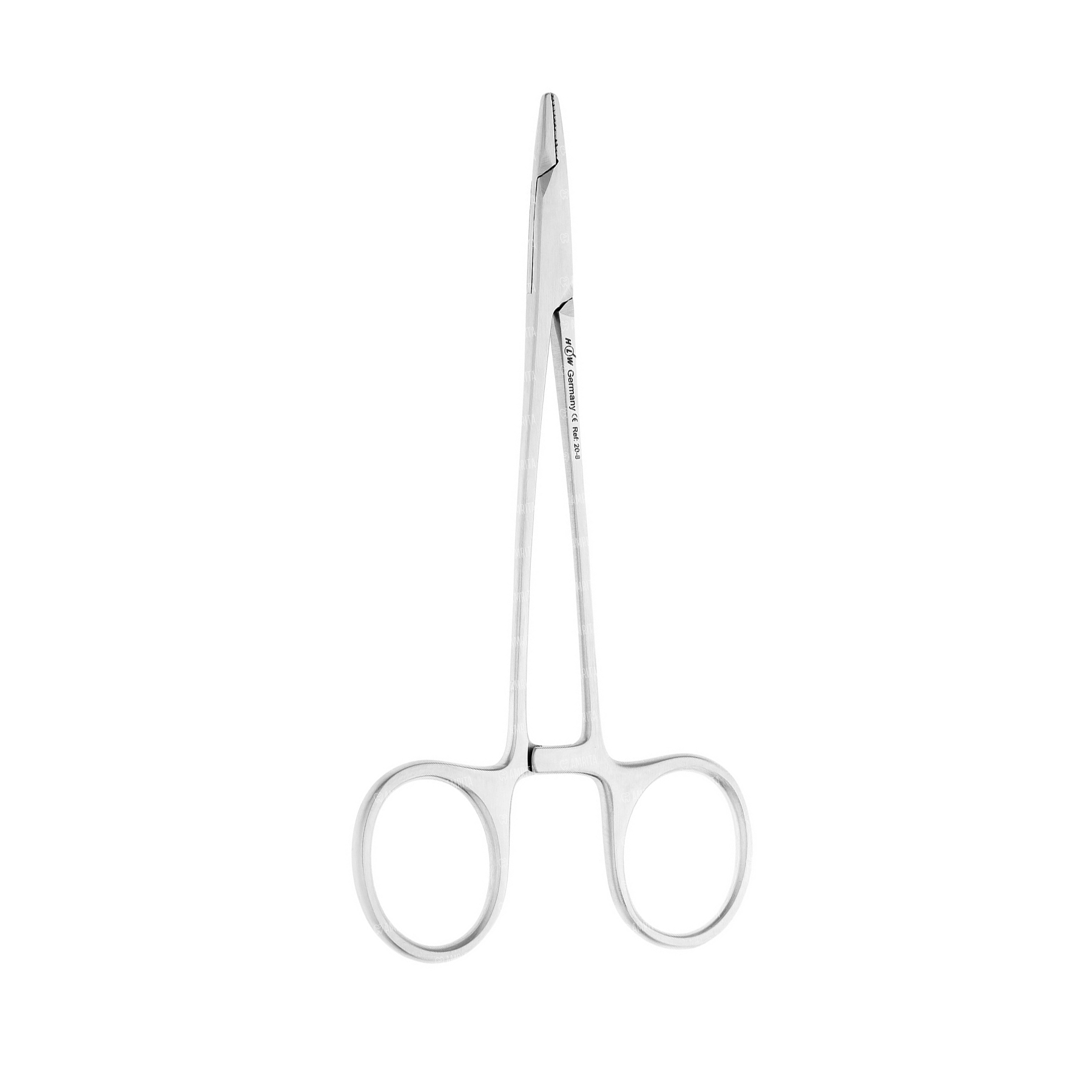 Иглодержатель хирургический конструкции ДЕРФ. Инструмент для наложения швов на поверхностно расположенные ткани, общей длиной не более 12,5 см, с перекрестным диагональным ретенционным рисунком на внутренней поверхности рабочих частей. Снабжен кольцевыми держателями и стандартным нажимным трехступенчатым фиксатором. Острые углы в местах смыкания инструмента сточены.