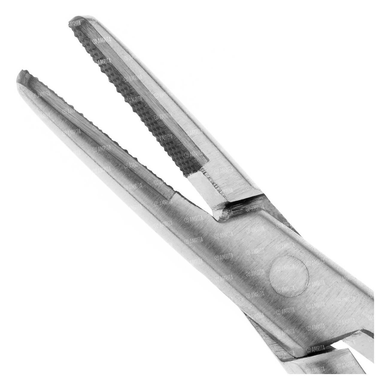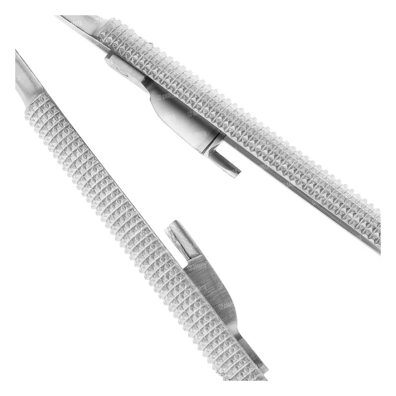 Рабочие поверхности инструмента имеют вставки из твердого сплава карбид-вольфрама, которые обеспечивают повышенную устойчивость к истиранию. Насечки на внутренней поверхности щечек препятствует скольжению иглодержателя по плоскости хирургической иглы. Короткие, узкие, тупоконечные рабочие части инструмента обеспечивают точность проведения иглы на всех стадиях наложения швов.