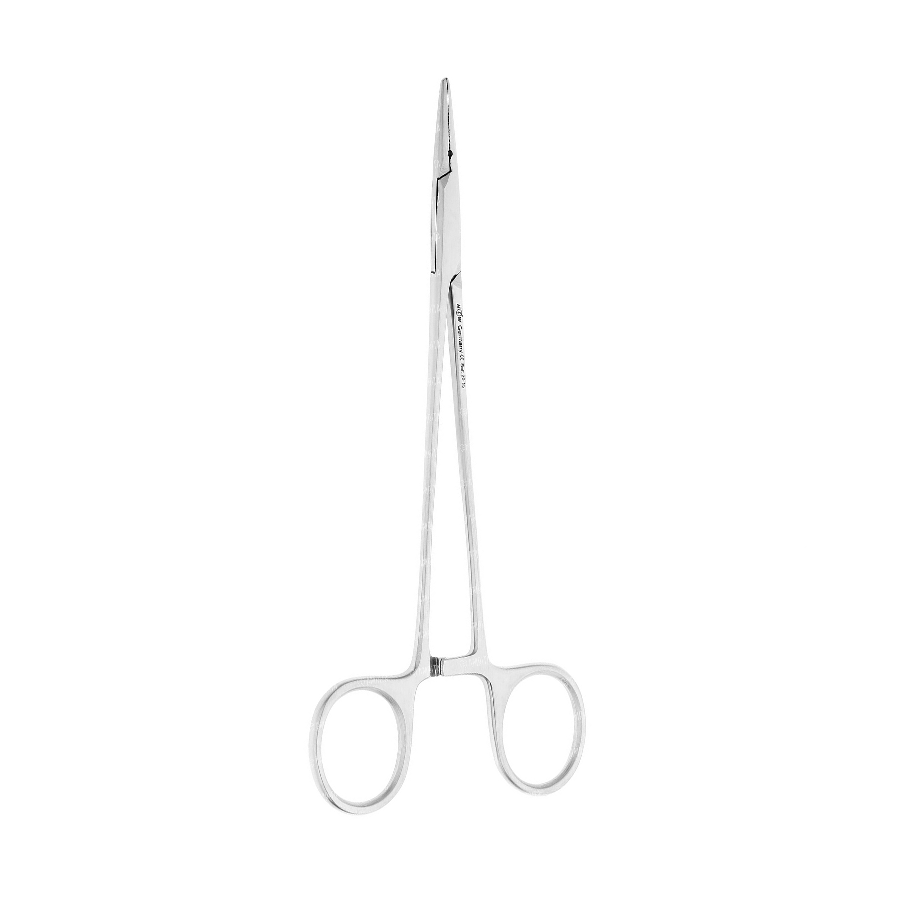 Иглодержатель конструкции КРИЛЯ-ВУДА. Снабжен стандартными кольцевыми держателями и трехступенчатым нажимным фиксатором. Внутренняя поверхность браншей имеет ретенционный диагональный микрорельеф и щелевидное углубление в центре, а так же поперечным желобком между щелевидным углублением и местом смыкания рабочих частей. Острые углы в местах смыкания инструмента сточены.