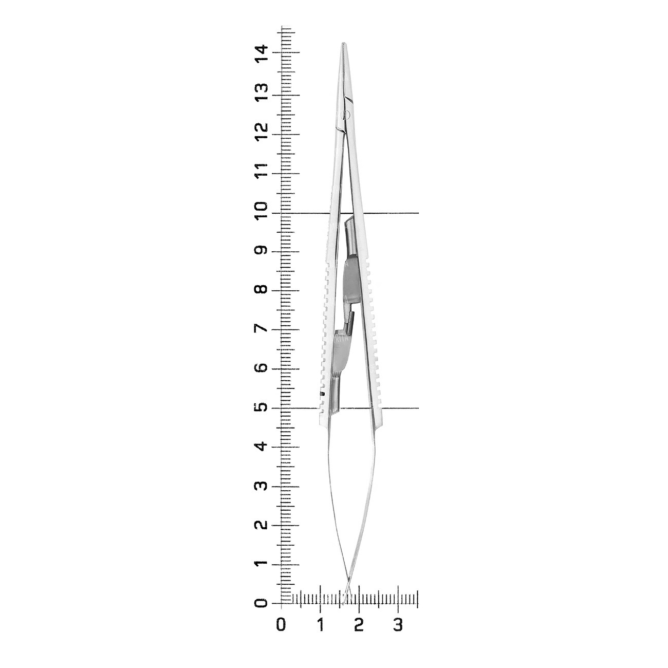 Иглодержатель безкольцевой хирургический КАСТРОВЬЕДЖО. Предполагает использование захвата по типу писчего пера. Наружная поверхность плоских ручек прямоугольной формы покрыта поперечными канавками для надежного удержания инструмента в руке. С внутренней стороны рукояток установлен нажимной одноступенчатый фиксатор.