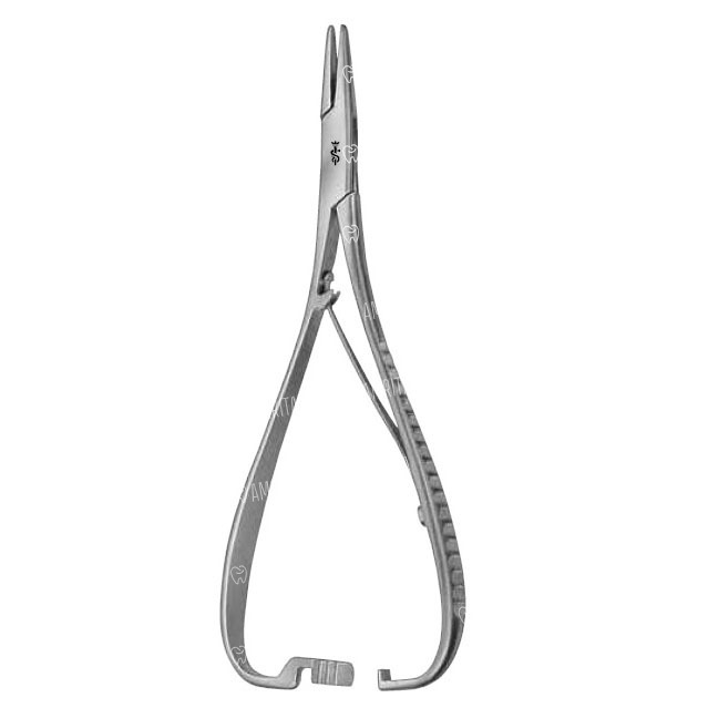 Иглодержатель по MATHIEU, длина 200 мм, BM362R, B.Braun (Aesculap, Германия) используют для удержания иглы, а также отрезания нити во время проведения хирургических операций. Инструмент состоит из полукруглых ручек, на которых нанесены поперечные бороздки, обеспечивающие крепкий захват в руке и препятствующие выскальзыванию. Между ручками расположен замок кремальера, фиксирующий положение рукоятки иглодержателя. Рабочая часть прямая, на внутренней стороне губок нанесены крестообразные насечки для крепкого удержания иглы.