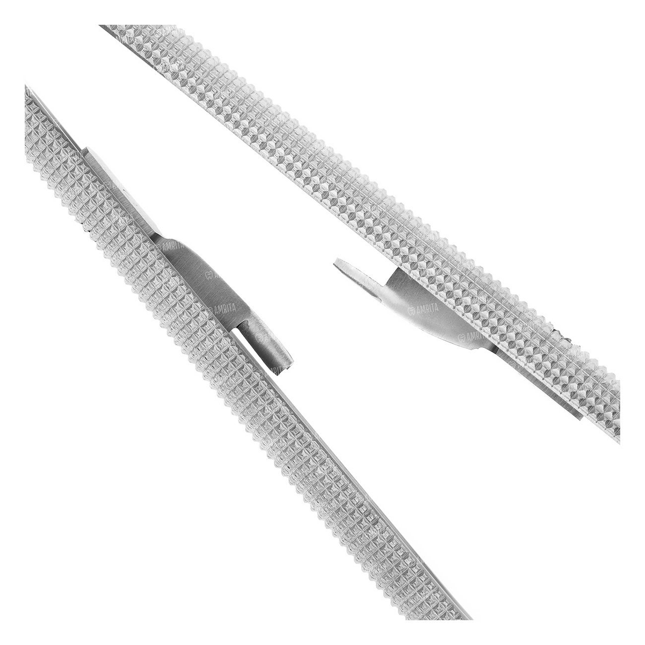 Иглодержатель безкольцевой хирургический КАСТРОВЬЕДЖО. Предполагает использование захвата по типу писчего пера. Наружная поверхность полукруглой формы покрыта продольно-поперечными насечками для надежного удержания инструмента в руке. С внутренней стороны рукояток установлен нажимной одноступенчатый фиксатор.