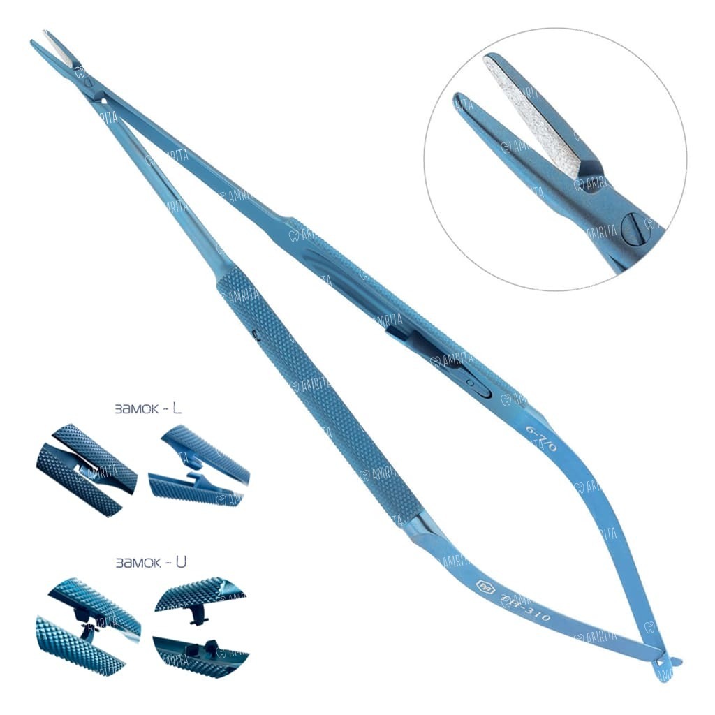 - Титановый сплав и продуманная конструкция рукояток передают врачу мельчайшие тактильные ощущения, позволяя точно контролировать усилие и чувствовать прохождение иглы через ткани;