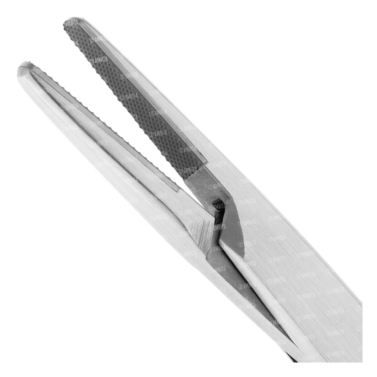 Иглодержатель конструкции МАЙО-ГЕГАРА. Снабжен стандартными кольцевыми держателями и трехступенчатым нажимным фиксатором. Внутренняя поверхность браншей имеет ретенционный диагональный микрорельеф. Острые углы в местах смыкания инструмента сточены. На рабочих частях имеются твердосплавные вставки из карбида вольфрама.