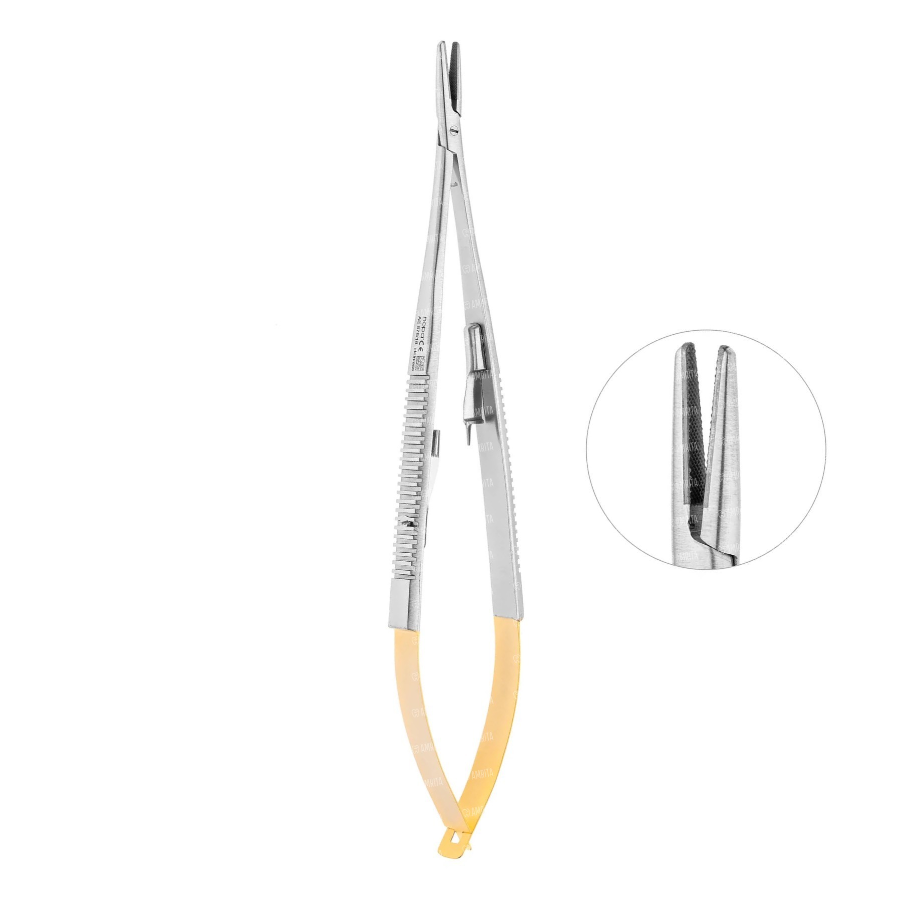 К каждой ручке прикреплена наружная пластиночная разводная пружина, увеличивающая срок службы и обеспечивающая плавный ход микроиглодержателя. На ручки инструмента снаружи нанесен ретенционный узор, предотвращающий скольжение фаланг пальцев в перчатке. С внутренней стороны рукояток иглодержателя установлен нажимной одноступенчатый фиксатор.