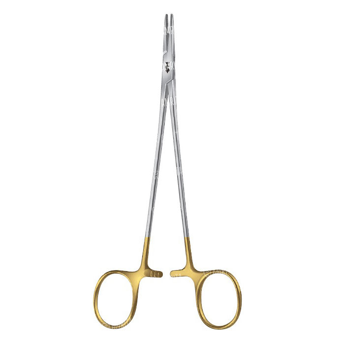 Иглодержатель по DE BAKEY, DUROGRIP, длина 150 мм, для нитей 4/0-6/0, BM032R, B.Braun (Aesculap, Германия) используют для наложения швов, как поверхностных на коже, так и при оперативных вмешательствах. Инструмент выполнен с твердосплавными вставками на основе кобальта, имеет эргономичную форму, с учетом анатомических особенностей, для удобного расположения в руке и точной работы врача. Кольца рукоятки позолоченные, между ними расположен замок - кремальера, который фиксирует положение рукояток иглодержателя. На браншах нанесены специальные насечки, которые позволяют прочно удерживать иглы в процессе наложения швов.