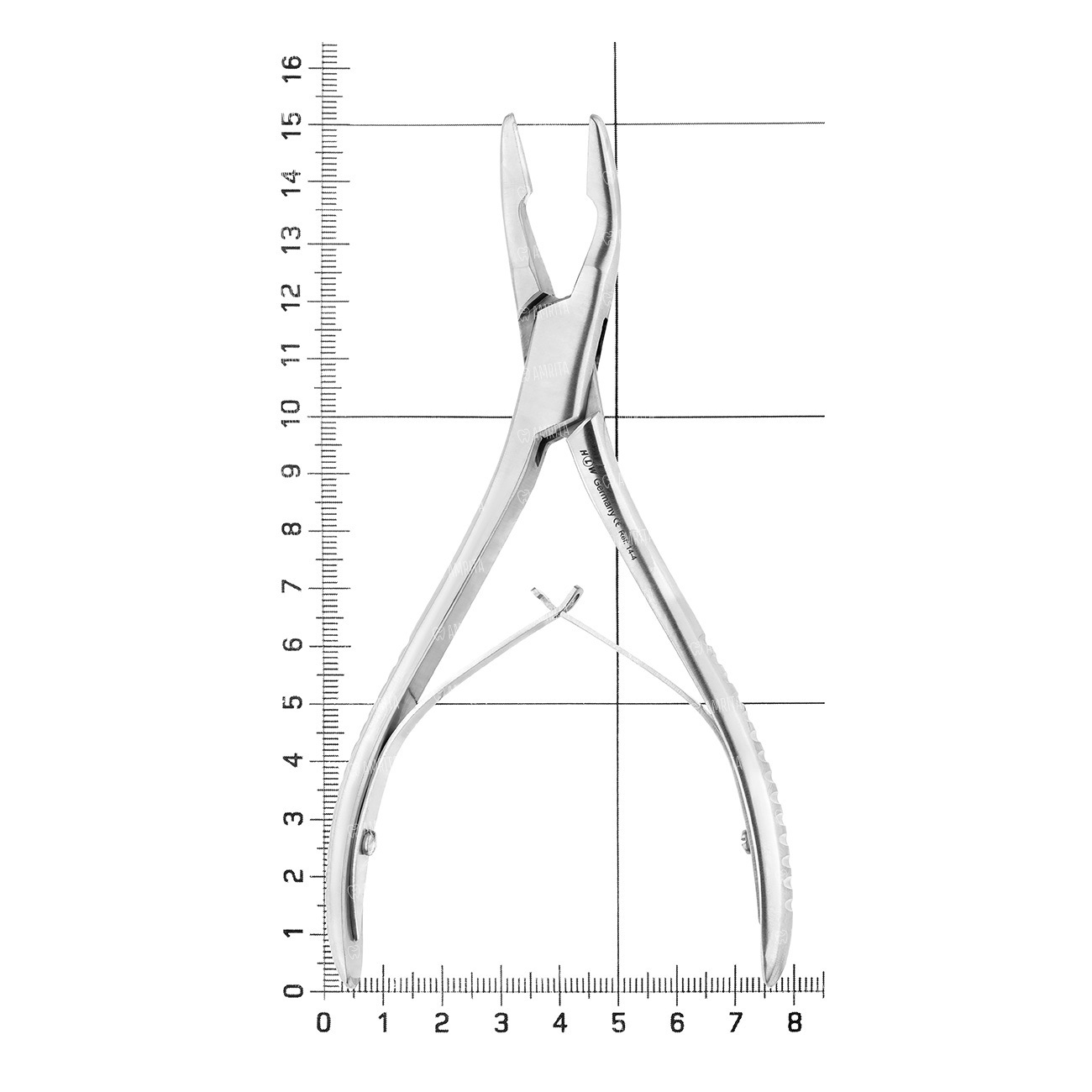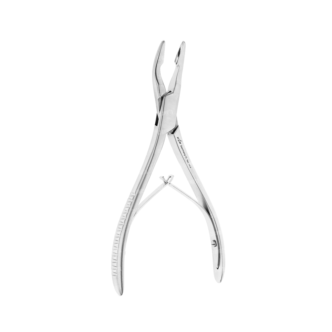 Кусачки костные конструкции ЛЮЭРА (по автору). Имеют двойной разнонаправленный изгиб по плоскости. Ширина рабочей части не более 3 мм. Ручки снабжены плоской разводной пружиной соединяющейся в центре. Общая длина инструмента не более 15 см.