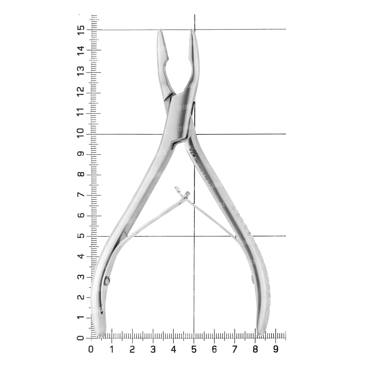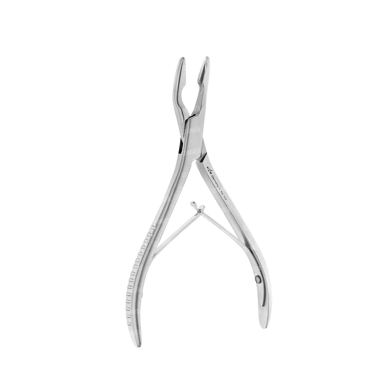 Кусачки костные конструкции ЛЮЭРА (по автору). Имеют двойной разнонаправленный изгиб по плоскости. Ширина рабочей части не более 3 мм. Ручки снабжены плоской разводной пружиной соединяющейся в центре.
