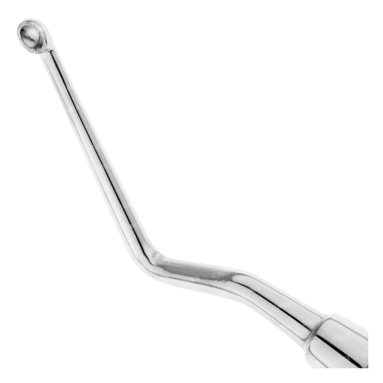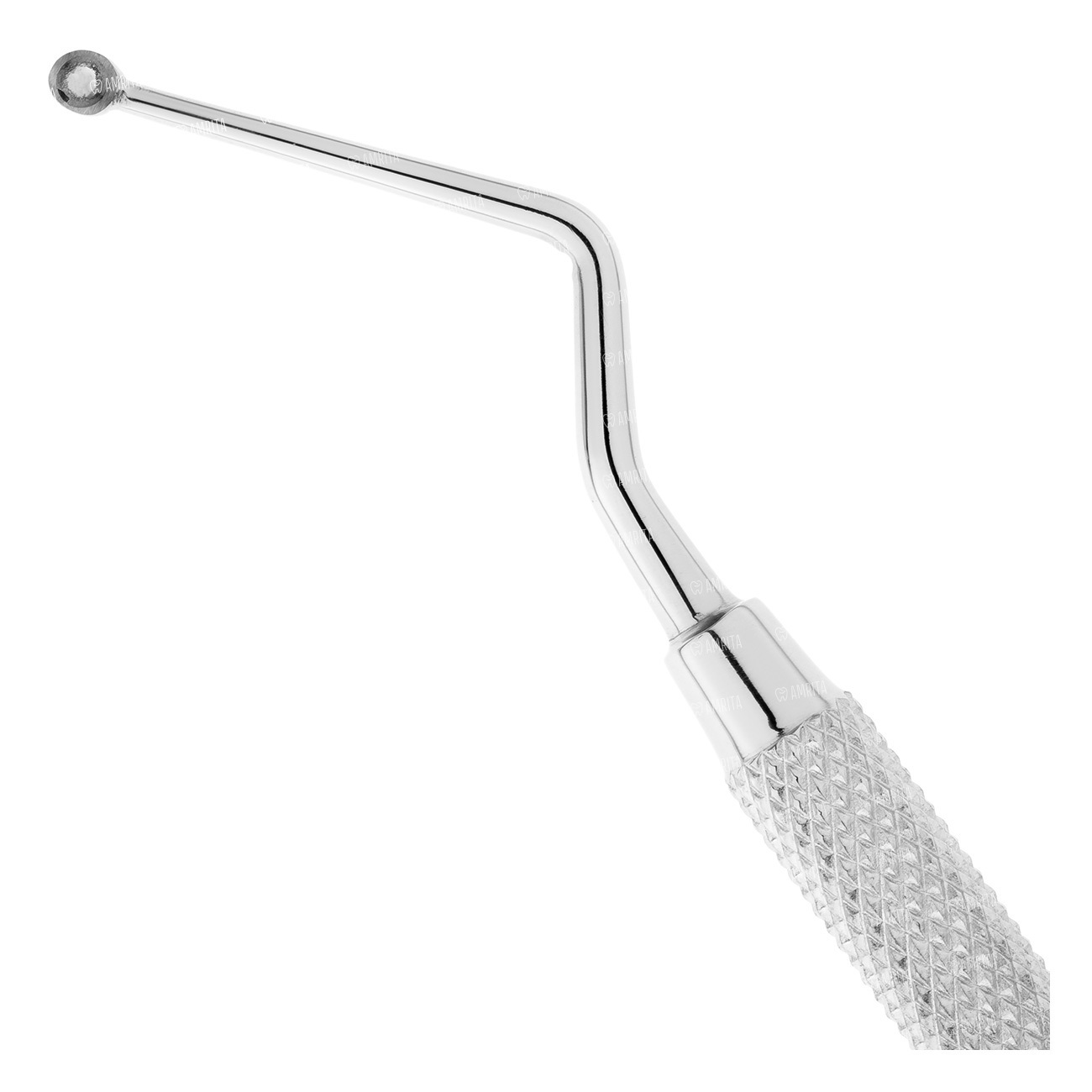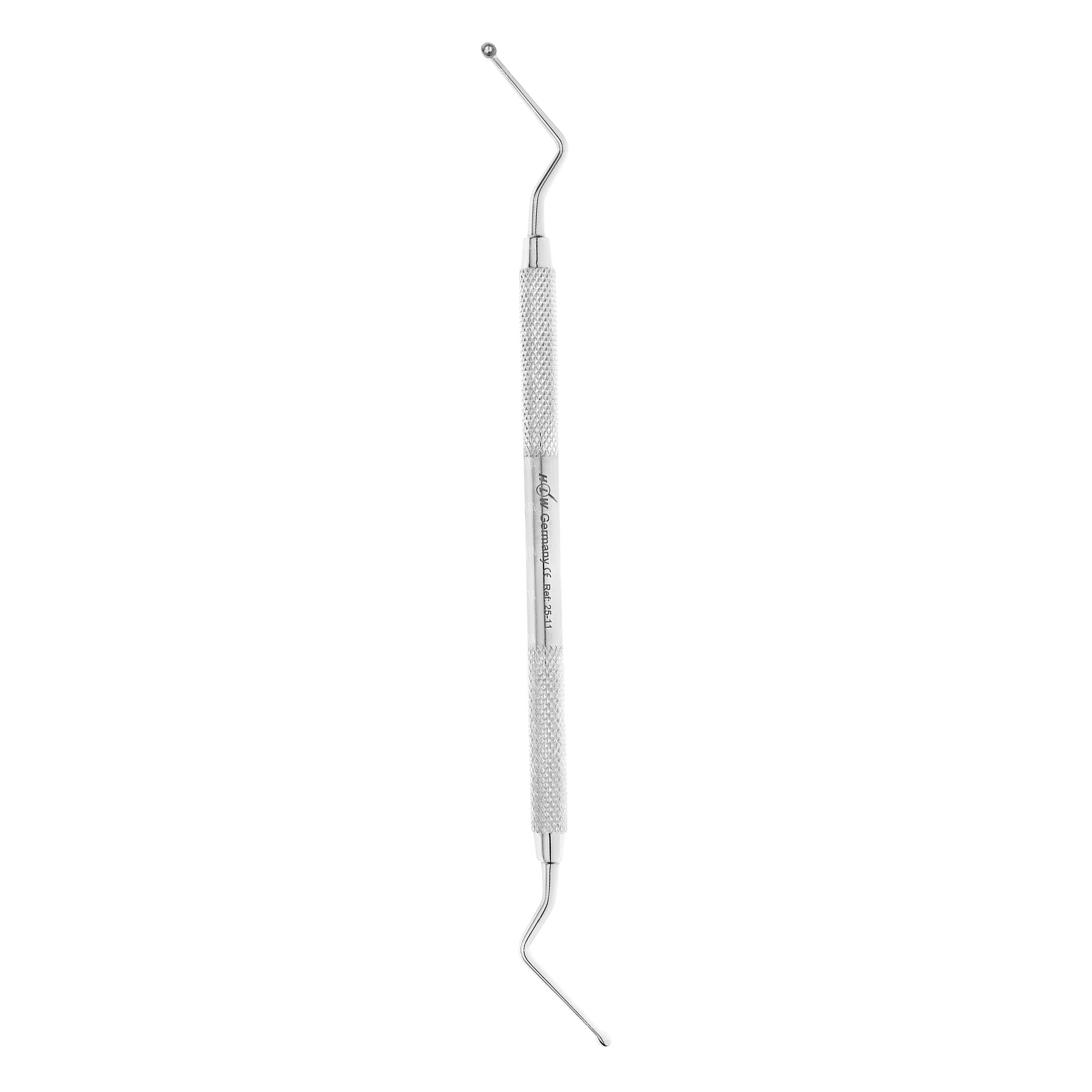 Ложка кюретажная двусторонняя изогнутая конструкции МАРТИНА удлиненная. Рабочие имеют двойной изгиб по ребру. Кончик рабочей частей представляет собой ложечку круглой формы с острыми гранями. Максимальная ширина рабочей части не более 2 мм. Ручка круглая диаметром не более 6 мм. Мартенситная сталь DIN 1.4006, X10Cr13 (ГОСТ 12X13). Твердость по Роквеллу 40-45 RW.