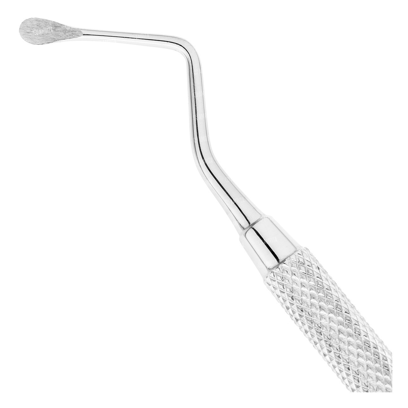 Ложка кюретажная двусторонняя изогнутая конструкции ЛУКАСА. Рабочие имеют двойной изгиб по ребру. Кончик рабочей частей представляет собой слегка изогнутую плоскость каплевидной формы с острыми гранями. Максимальная ширина рабочей части не более 3 мм. Ручка круглая диаметром не более 6 мм. Мартенситная сталь DIN 1.4006, X10Cr13 (ГОСТ 12X13). Твердость по Роквеллу 40-45 RW.