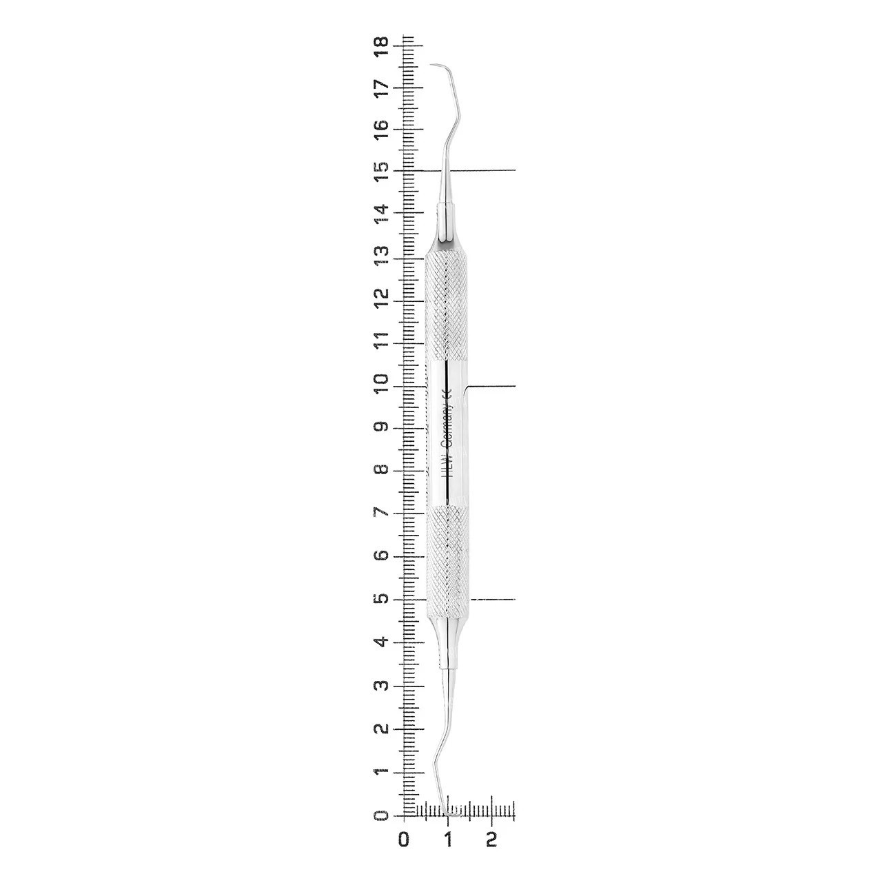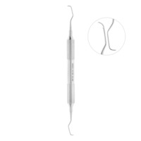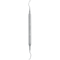 Кюрета парадонтологическая ГРЕЙСИ (по автору) зоноспецифическая. Рабочая часть кюреты имеет значительно изогнутую режущую грань средней длинны, угол терминального колена в 150 градусов, используется для удаления зубных отложений в области клыков и премоляров верхней и нижней челюсти. Имеет два желтых автоклавируемых маркировочных кольца. Эргономичная полая ручка с ретенционным рисунком диаметром не менее 10 мм.