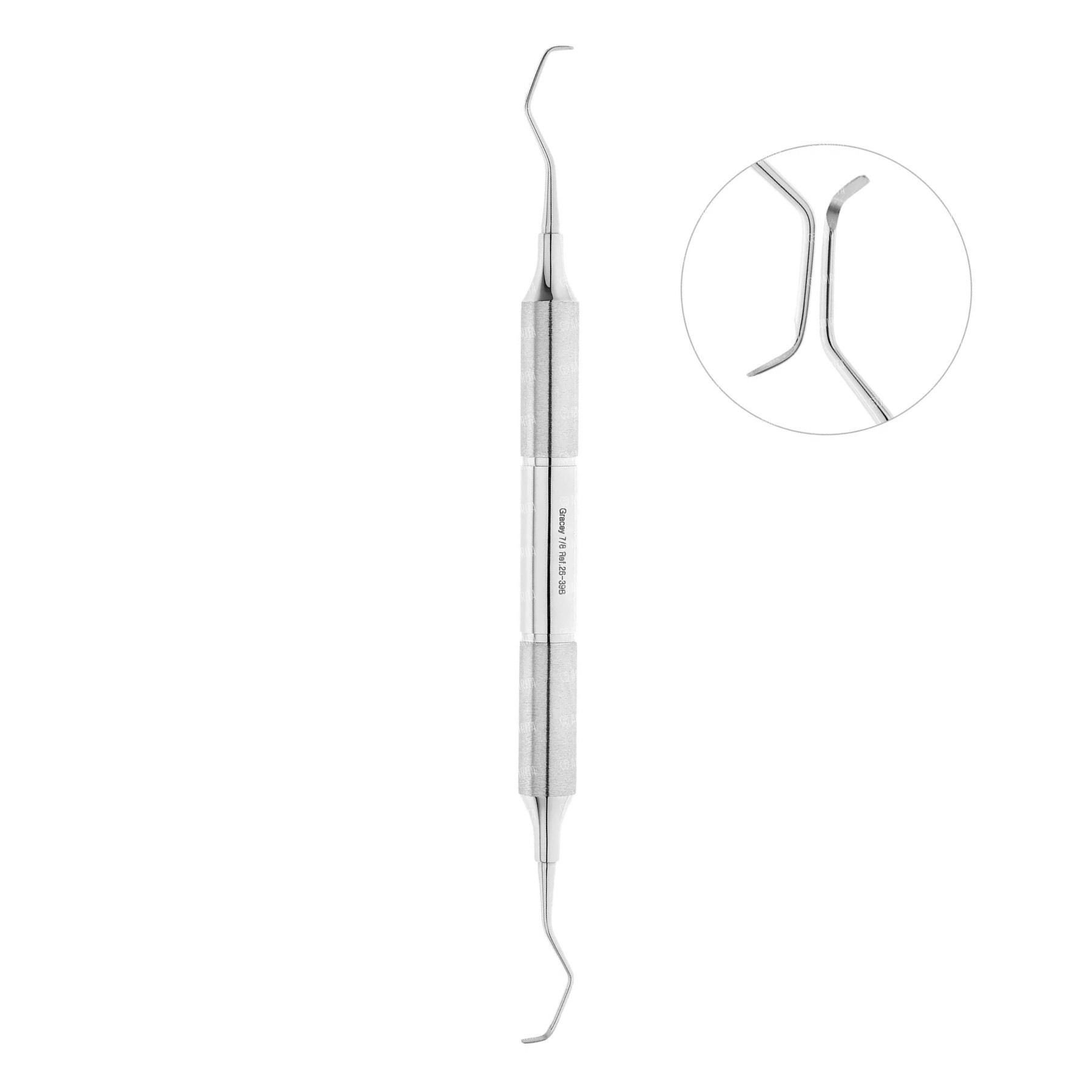 Кюрета парадонтологическая ГРЕЙСИ (по автору) зоноспецифическая. Рабочая часть кюреты имеет длинную значительно изогнутую режущую грань, угол терминального колена в 120 градусов, служит для удаления десневого и поддесневого камня в области клыков и премоляров верхней и нижней челюсти. На промежуточных частях имеются маркировочные кольца красного цвета.