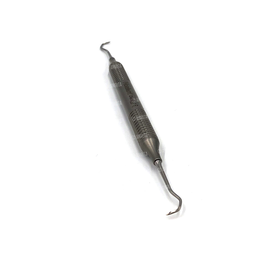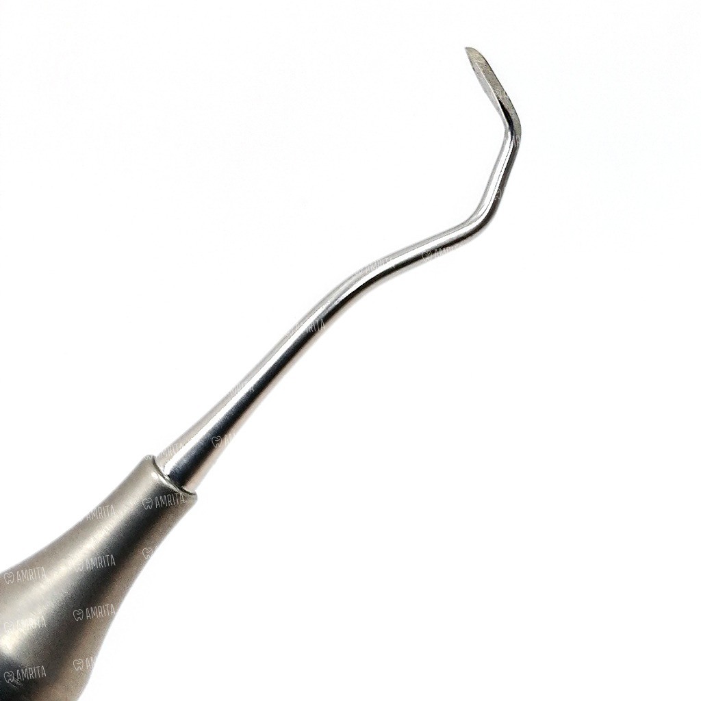 Скейлер Джакветте, двусторонний, круглая рукоятка, для передних зубов. Большое лезвие имеет длину 5 мм и ширину 1 мм, маленькое лезвие имеет длину 4 мм и ширину 0,9 мм, оба лезвия сужаются к острию.