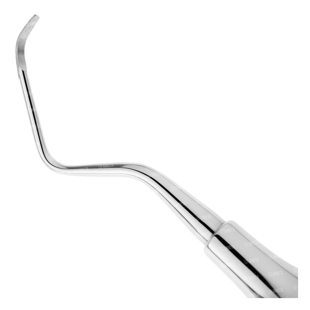 С обоих концов двусторонней ручки кюреты расположены зеркально отраженные рабочие части, каждая из которых имеет форму полукруга с острыми режущими краями. Рабочая часть инструмента имеет закругленный рабочий кончик и только один режущий край, расположенный под углом 60-70° по отношению к терминальному стержню. Такая конструкция кюреты идеально подходит для работы в глубоких пародонтальных карманах и способствует эффективному проведению манипуляций.
