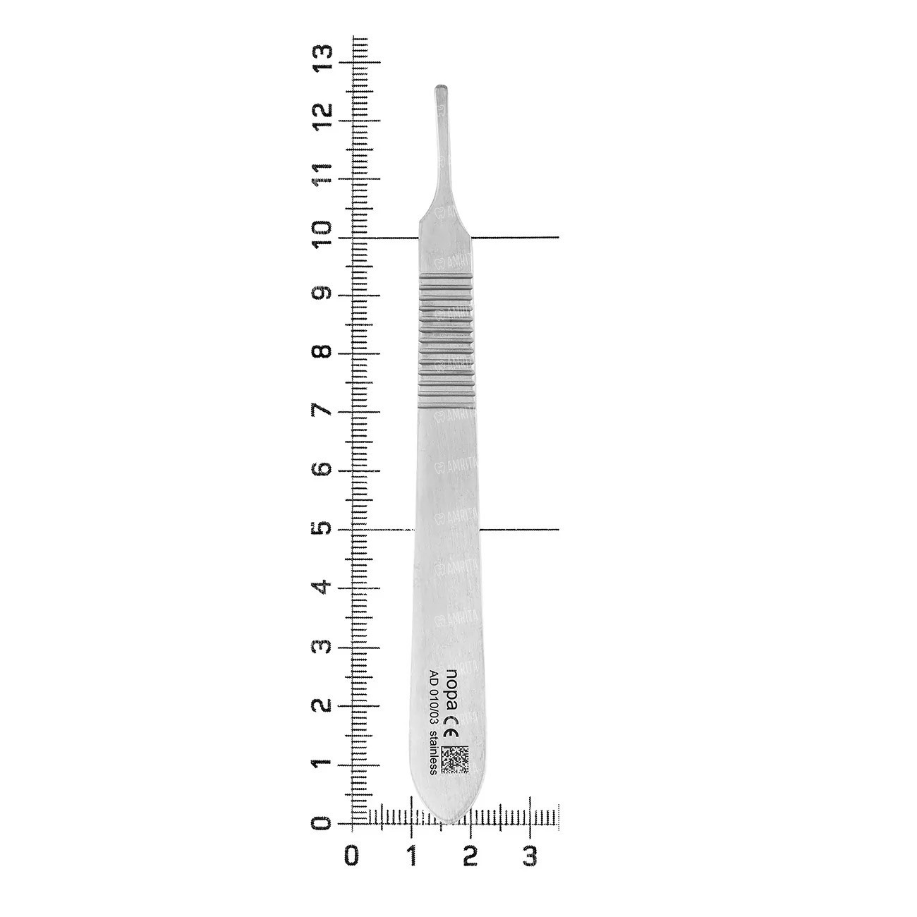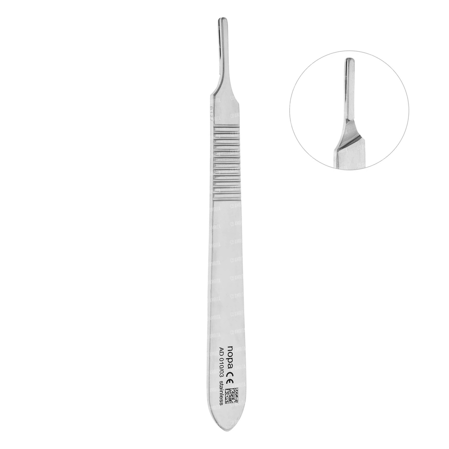 Рукоятка для скальпеля №3 торговой марки Nopa Instruments предназначена для эффективной фиксации одноразового лезвия. Держатель для скальпеля имеет плоскую, продолговатую форму с ретенционными поперечными бороздками на поверхности ручки, благодаря которым стоматологический инструмент надежно фиксируется в руке и способствует проведению хирургических манипуляций.