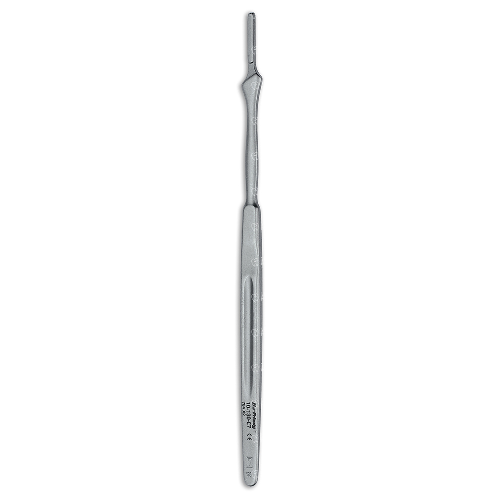 Форма и размер позволяют максимально точно контролировать инструмент. Рельефная поверхность в области захвата не дает скальпелю выскальзывать.
