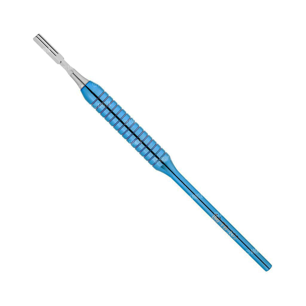 - Рукоятка изготовлена из титана, полностью биосовместимого и сверхлегкого материала, который не вызывает раздражения тканей и аллергических реакций. Благодаря минимальному весу инструмент удобно лежит в руке, позволяя специалисту комфортно проводить длительные операции без усталости и снижения точности движений;