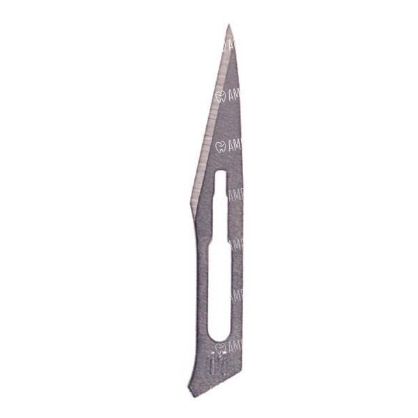 Продолговатое лезвие треугольной формы, заточенным по гипотенузе треугольника и имеющим прочный заостренный кончик, идеально подходящий для разрезов колющим движением. Применяется для выполнения разрезов при дренировании плевральной полости, вскрытия коронарных артерий, аорты и удаления кальцификатов с аортального или митрального клапана. Лезвия индивидуально упакованы в фольгу, ориентированы в одну сторону и уложены в транспортную тару. Совместимы с ручкой для скальпелей № 3. Углеродистая хирургическая сталь не вызывает побочных эффектов в организме человека и обладает биологической совместимостью. Стерилизовано гамма-излучением.