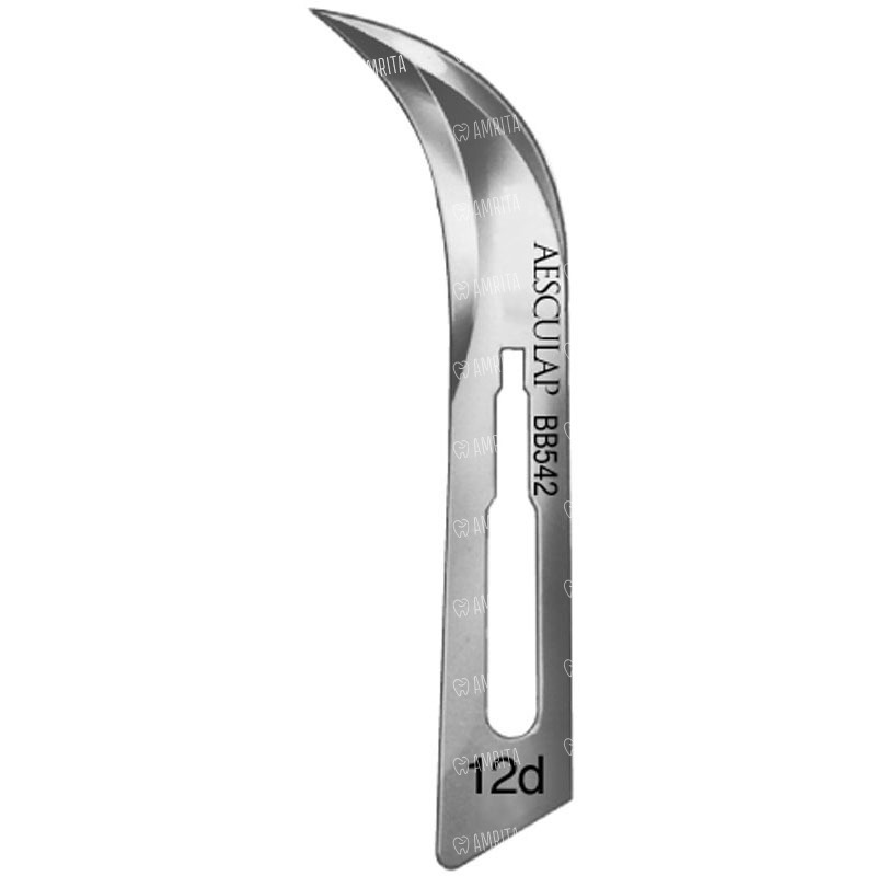 Скальпель №12, лезвие, стерильное, ББраун (B.Braun) Aesculap, Германия, BB542. Лезвия изготовлены из нержавеющей стали и предназначены для рассечения мягких тканей и сосудов в полости рта во время хирургических и пародонтологических операций. Они закрепляются на рукоятках перед использованием и удаляются после проведения манипуляций.